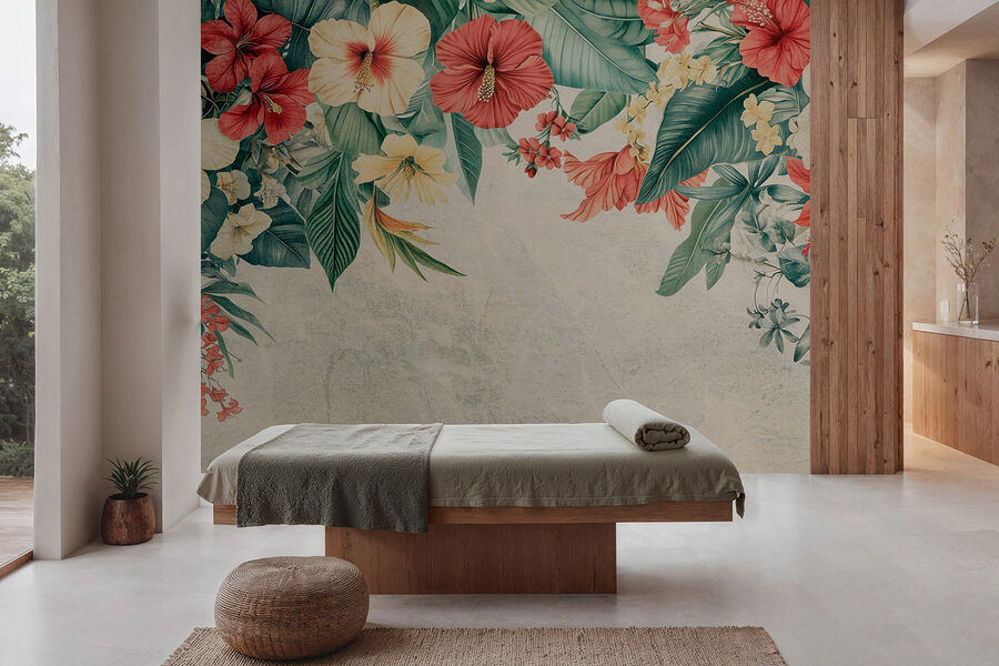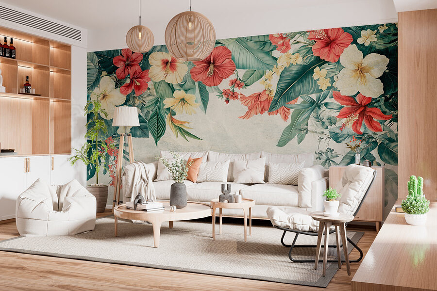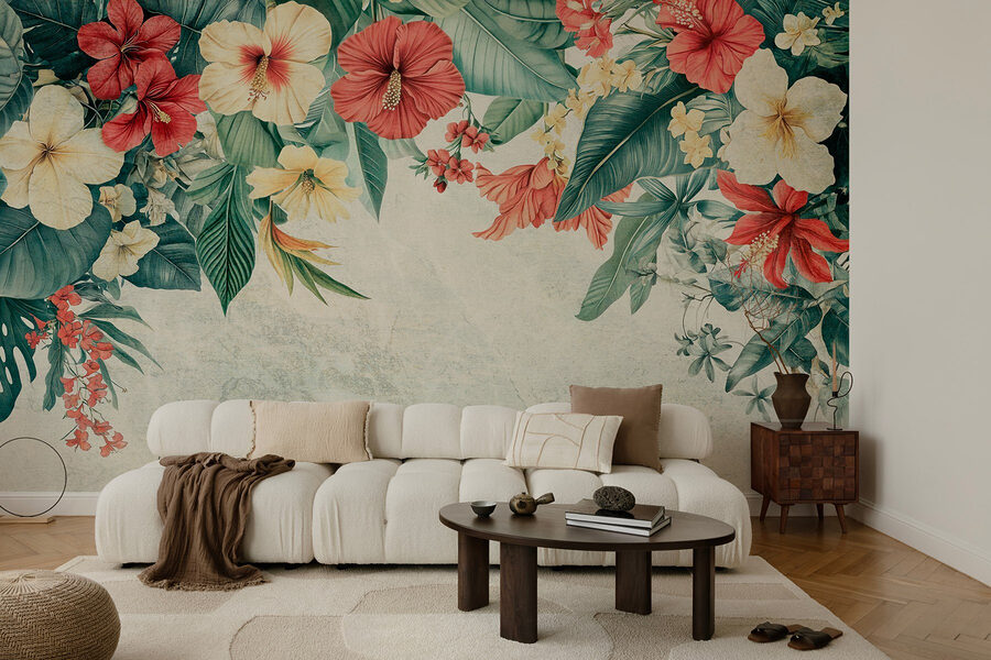 Transformați-vă spațiul într-un paradis tropical cu acest mural, „Flori vibrante încadrează un fundal seren”. Imaginați-vă: intrați în camera dvs. și, bam! Sunteți întâmpinați de flori pline de culoare, ca și cum o zi de primăvară s-ar fi instalat permanent pe peretele dvs. Amestecul de hibiscus roșu, galben cremos și verde intens creează o încântare senzorială – este ca și cum natura ar arunca confetti. Imaginați-vă că savurați cafeaua de dimineață aici; este ușor să uitați de lumea exterioară. În plus, vă aduce atmosfera de vacanță direct în casa dvs., fără a mai fi nevoie de loțiune de protecție solară. Perfect pentru sufragerie sau pentru un colț confortabil, acest mural are caracter și farmec. Cine nu și-ar dori o mică bucată din frumusețea naturii încadrată cu atâta stil?