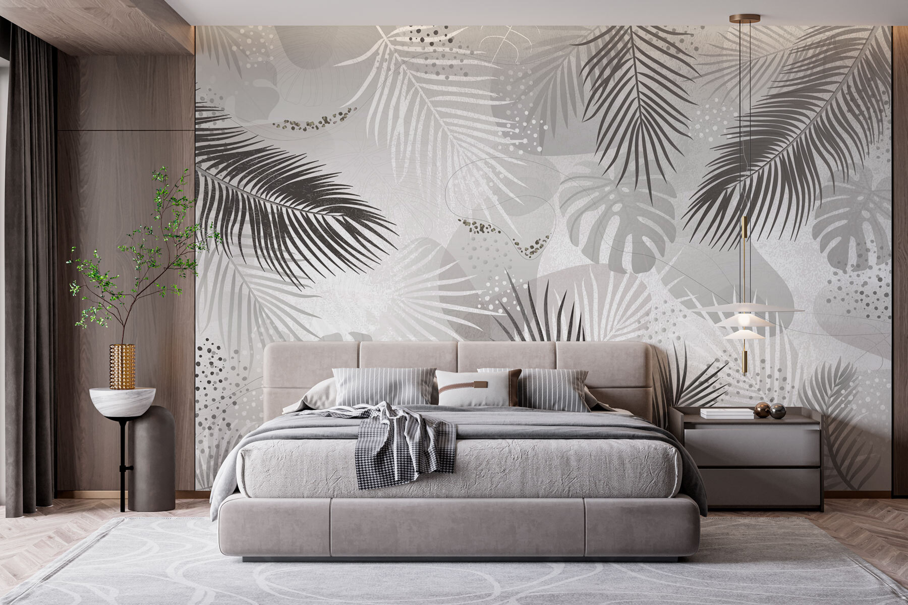 Transformați orice cameră cu acest tapet uimitor, cu un fundal elegant în culori gri și alb, decorat cu frunze elegante. Este ca și cum ați aduce o adiere de tropice în casa dvs., fără umiditate! Imaginați-vă că intrați în spațiul dvs. de locuit și simțiți calmul naturii cuprinzându-vă. Jocul jucăuș al nuanțelor poate stârni invidia celor din jur, mai ales în timpul reuniunilor – toată lumea vă va întreba de unde l-ați găsit. Acest fototapet nu doar decorează, ci creează o atmosferă, transformând pereții banali într-o declarație de stil. Perfect pentru oricine dorește să adauge o notă de modernitate, păstrând în același timp serenitatea și rafinamentul. Cine ar fi crezut că un perete poate fi atât de primitor?