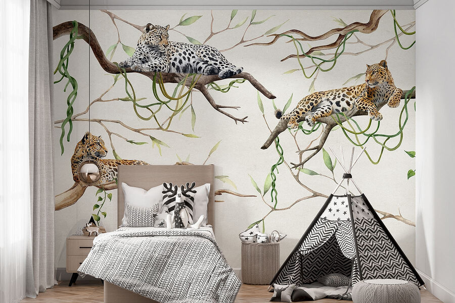Transformați-vă spațiul într-o oază tropicală cu acest tapet uimitor cu leoparzi care se odihnesc pe crengi. Imaginați-vă că intrați în cameră și simțiți căldura junglei, în timp ce aceste feline majestuoase par să vă vegheze, perfect relaxate printre vegetația vibrantă. Are acel amestec perfect de sălbăticie și seninătate, aducând o notă de natură în interior, fără a vă face griji pentru comportamentul animalelor reale. Prietenii ar putea chiar glumi că ești în secret un fotograf de animale sălbatice, fără bocancii de drumeție și mușcăturile de țânțari. Așadar, dă-i drumul, lasă pereții să spună o poveste, învăluind spațiul tău într-o evadare confortabilă și exotică. Perfect pentru sufragerii sau pentru a crea o atmosferă unică în birou, acest fototapet este gata să dea viață oricărei camere cu frumusețea naturii.