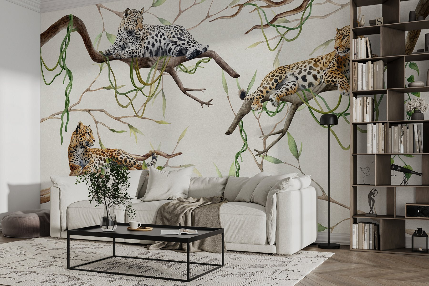 Transformați-vă spațiul într-o oază tropicală cu acest tapet uimitor cu leoparzi care se odihnesc pe crengi. Imaginați-vă că intrați în cameră și simțiți căldura junglei, în timp ce aceste feline majestuoase par să vă vegheze, perfect relaxate printre vegetația vibrantă. Are acel amestec perfect de sălbăticie și seninătate, aducând o notă de natură în interior, fără a vă face griji pentru comportamentul animalelor reale. Prietenii ar putea chiar glumi că ești în secret un fotograf de animale sălbatice, fără bocancii de drumeție și mușcăturile de țânțari. Așadar, dă-i drumul, lasă pereții să spună o poveste, învăluind spațiul tău într-o evadare confortabilă și exotică. Perfect pentru sufragerii sau pentru a crea o atmosferă unică în birou, acest fototapet este gata să dea viață oricărei camere cu frumusețea naturii.
