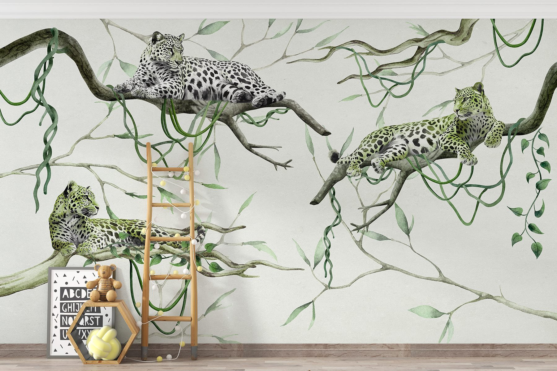 Transformați o cameră într-un refugiu liniștit în junglă cu acest mural uimitor care prezintă un grup de leoparzi care se relaxează pe crengi. Imaginați-vă că intrați în spațiul dvs. și simțiți instantaneu atmosfera de liniște a vieții sălbatice. Acești leoparzi par să spună: „Relaxați-vă, meritați asta!” Cu petele lor jucăușe și pozițiile confortabile, parcă vă invită să vă relaxați și să savurați momentul.