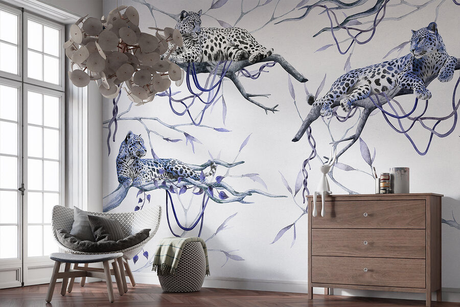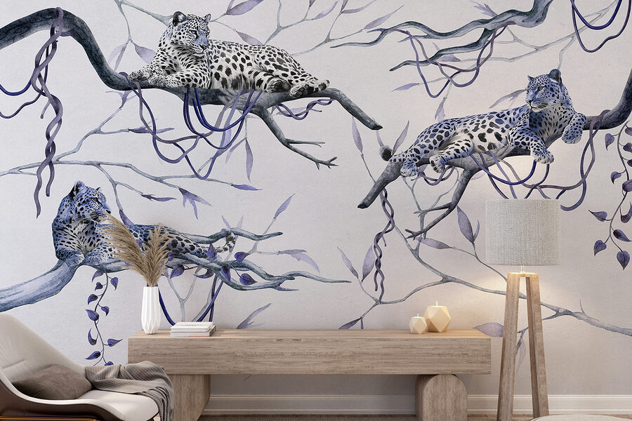 Transformați-vă spațiul într-un paradis junglă cu acest mural captivant cu leoparzi care se odihnesc pe crengi. Imaginați-vă că vă treziți și simțiți că ați intrat într-o pădure liniștită. Aceste feline magnifice, cu petele lor impresionante și comportamentul calm, aduc o atmosferă aparte în cameră. Perfect pentru sufragerie sau pentru un colț confortabil, acest mural nu este doar un decor, ci este ca și cum ați avea o bucățică de natură chiar acasă. Culorile delicate și detaliile artistice invită la visare cu ochii deschiși despre aventuri tropicale, oferind în același timp relaxare. Este locul în care sălbăticia întâlnește căldura – cine nu și-ar dori asta?