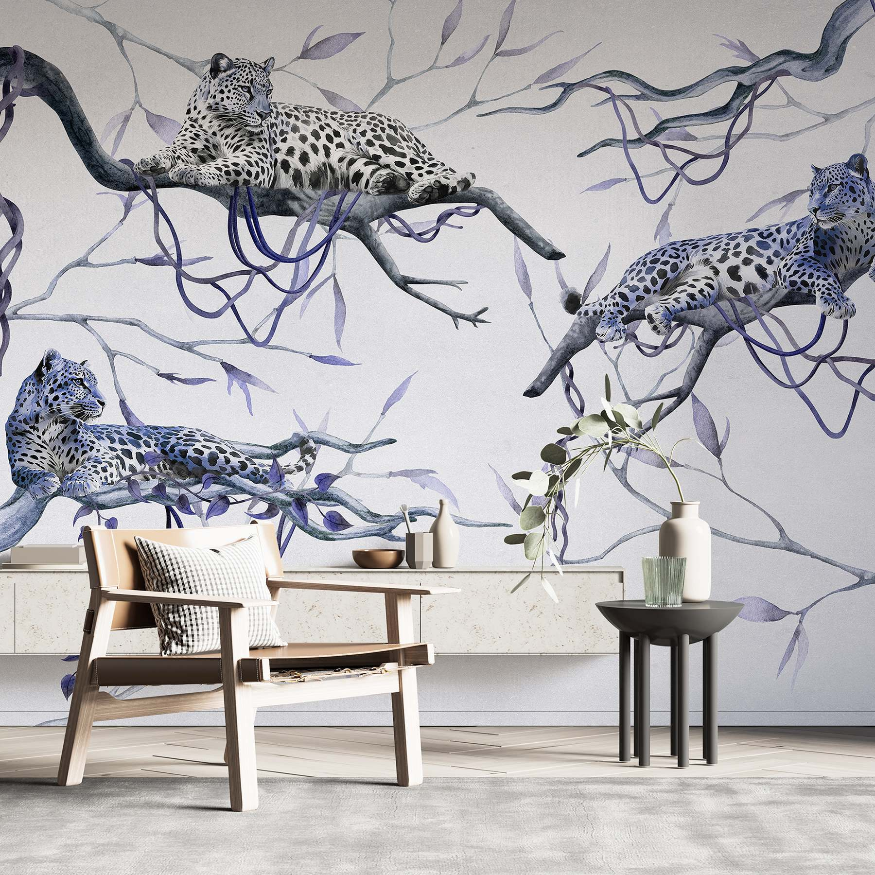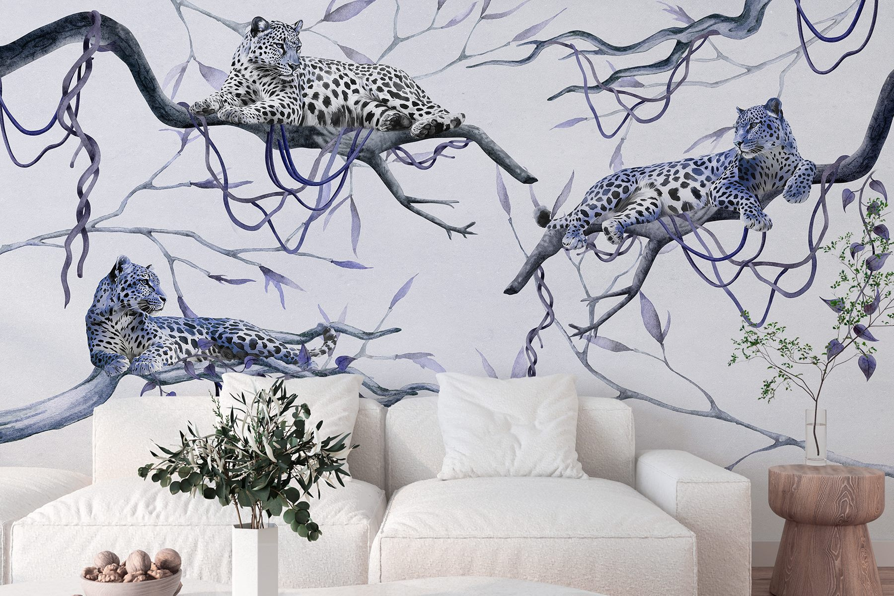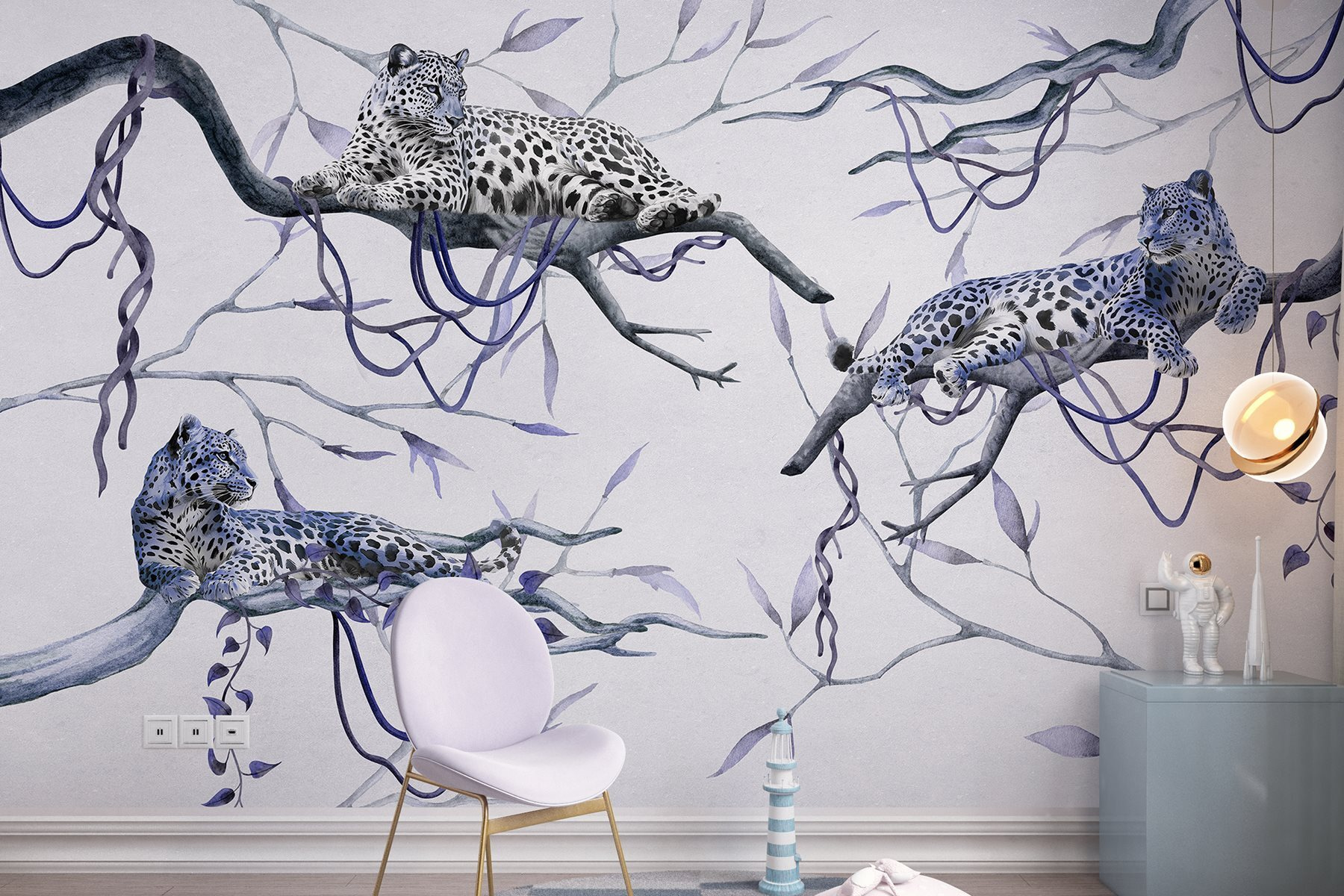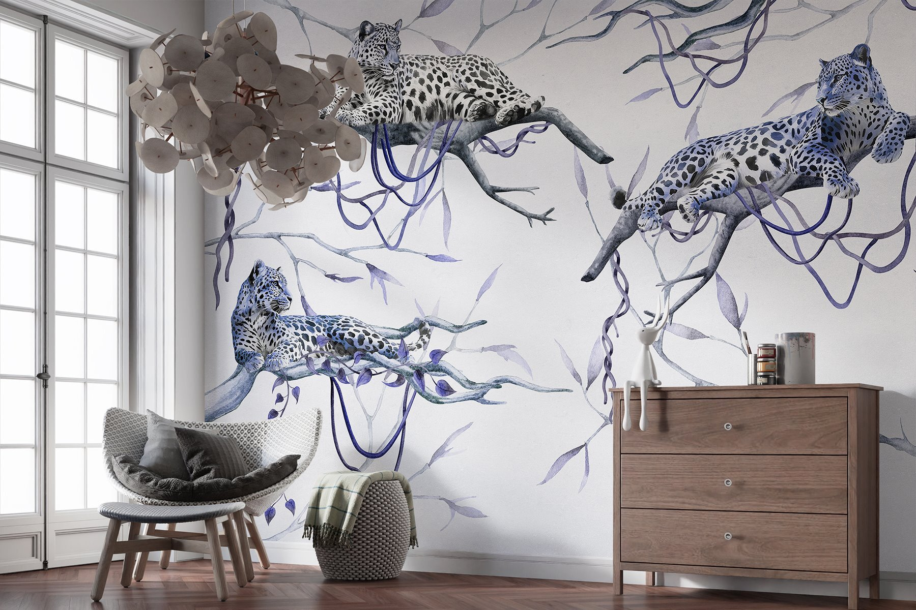 Transformați-vă spațiul într-un paradis junglă cu acest mural captivant cu leoparzi care se odihnesc pe crengi. Imaginați-vă că vă treziți și simțiți că ați intrat într-o pădure liniștită. Aceste feline magnifice, cu petele lor impresionante și comportamentul calm, aduc o atmosferă aparte în cameră. Perfect pentru sufragerie sau pentru un colț confortabil, acest mural nu este doar un decor, ci este ca și cum ați avea o bucățică de natură chiar acasă. Culorile delicate și detaliile artistice invită la visare cu ochii deschiși despre aventuri tropicale, oferind în același timp relaxare. Este locul în care sălbăticia întâlnește căldura – cine nu și-ar dori asta?