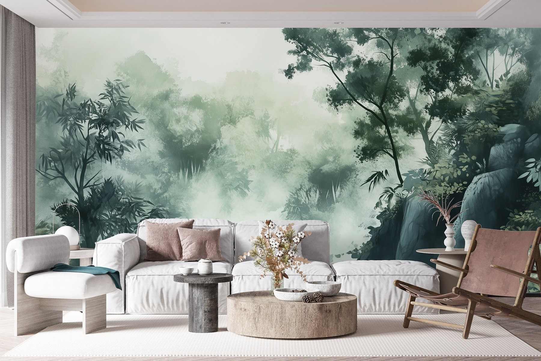 Step into a dreamy escape with the “Foggy Forest” mural—it’s like bringing a piece of nature inside, minus the mud on your shoes. Imagine sipping coffee, wrapped in a cozy blanket, with this enchanting backdrop whispering tales of tranquil mornings and gentle breezes. Those trees standing tall and proud? They’re your new calming companions, reminding you to slow down just a bit. The soft fog adds a sprinkle of mystery, making it feel like the forest is inviting you for an adventure. Perfect for a living room or a quiet reading nook, it’s the kind of decor that makes you wanna just breathe deeply and let go of the chaos outside!