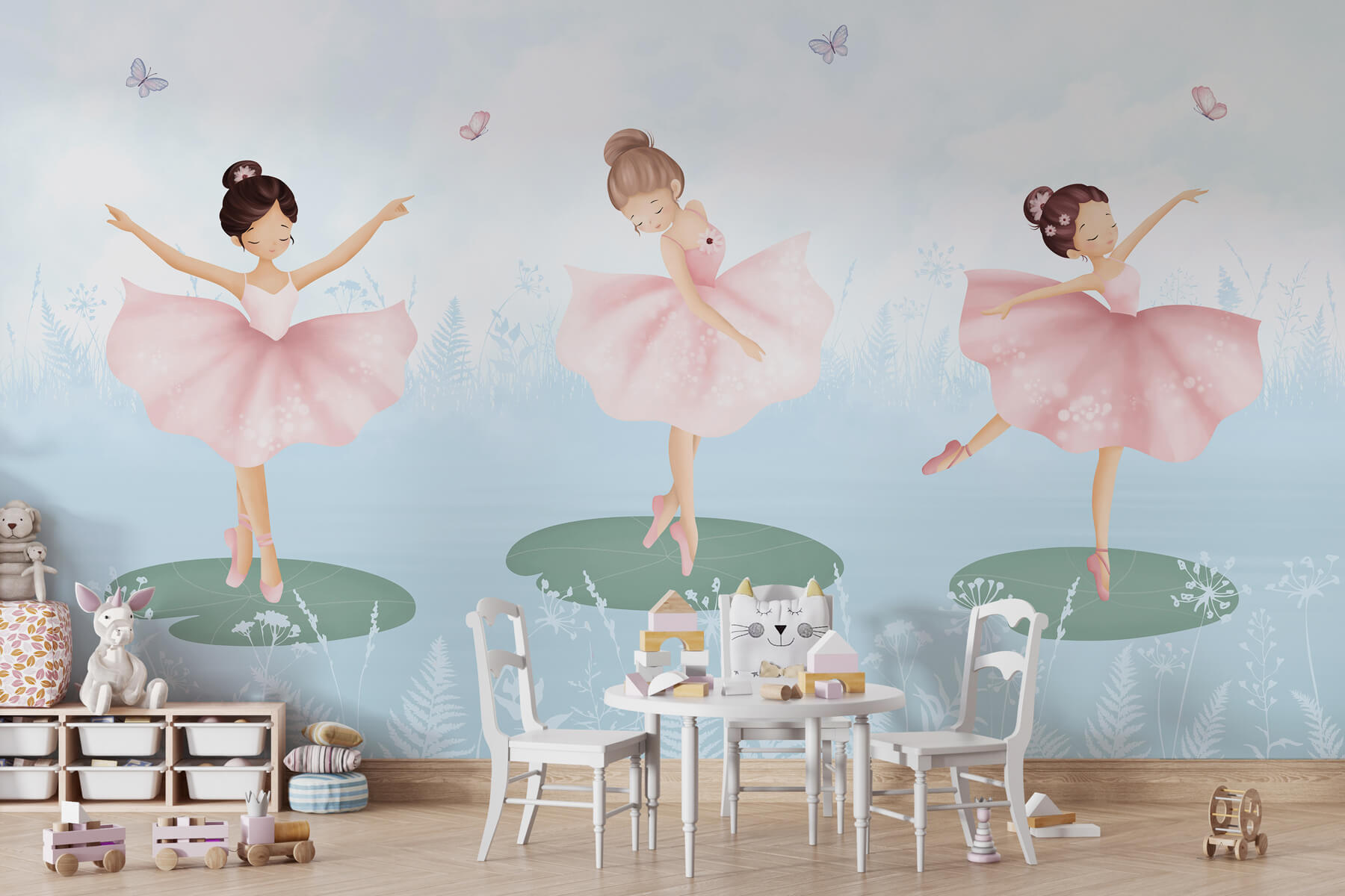 Transformați camera unui copil într-un tărâm magic al minunilor cu această pictură murală capricioasă cu un trio de fete fermecătoare care dansează în tutu-uri roz pe nuferi. Imaginați-vă chicotelile pe măsură ce micuții văd fluturii zburând în jur, adăugând un strop de încântare la timpul lor de joacă. Este ca și cum ai invita un basm chiar în casă. Perfectă pentru a stimula imaginația în timpul orelor de povești sau doar pentru a înveseli un colț confortabil, această pictură murală aduce un vibe jucăuș care poate face pe oricine să zâmbească. Imaginați-vă – pantofi dansatori, râsete și un strop de bucurie în fiecare privire.