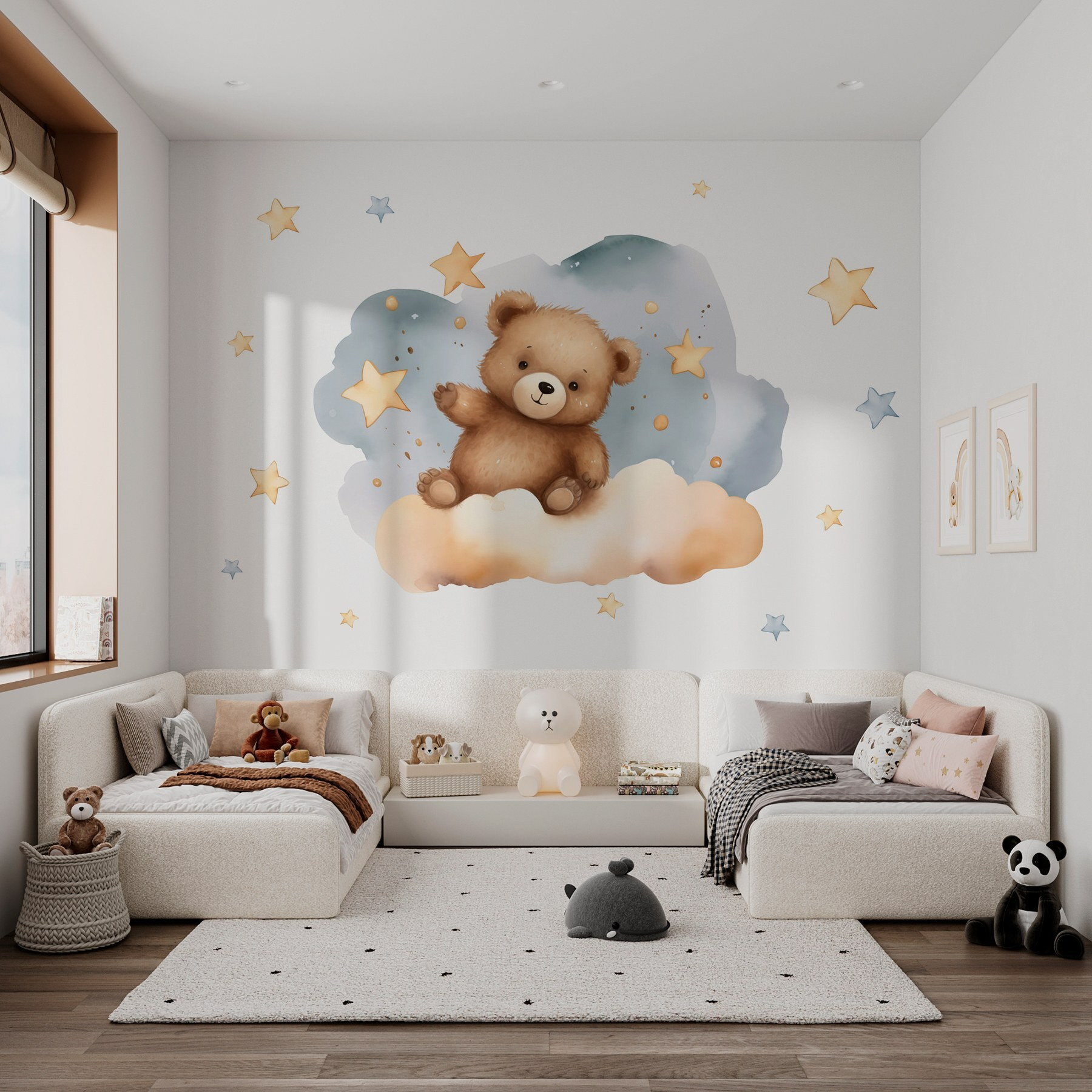 Transformați orice spațiu într-o țară a minunilor de vis cu muralul „Teddy Bear on a Cloud” (Ursuleț pe nor)! Imaginați-vă: un ursuleț pufos așezat pe un nor, care vă face cu mâna ca și cum tocmai v-ar fi zărit din cealaltă parte a camerei. Albastrul deschis și galbenul delicat creează o atmosferă confortabilă și liniștită, perfectă pentru o cameră de copii sau o cameră de joacă. Imaginați-vă micuții privind această scenă adorabilă, adormind în timp ce visează la nori pufoși și nopți înstelate. Acest mural nu este doar drăguț, ci învelește camera într-o atmosferă caldă și fantezistă. Este ca și cum ați avea un prieten magic pe perete, gata să inspire vise dulci și zâmbete nesfârșite! În plus, este un excelent subiect de conversație – cine nu s-ar îndrăgosti de un ursuleț atât de încântător?