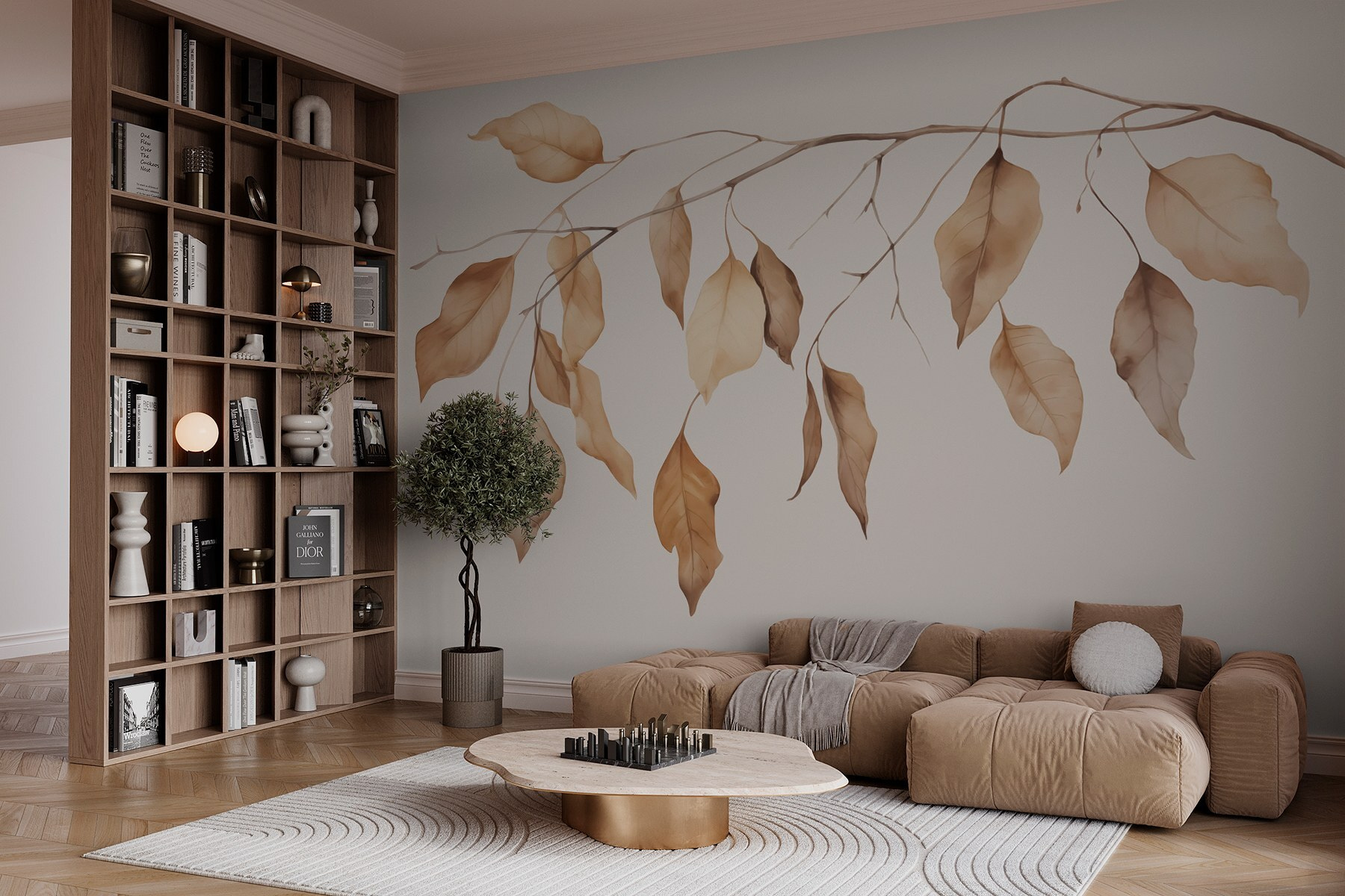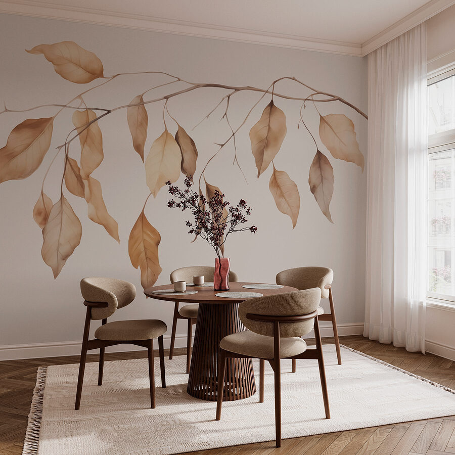Transformați un perete gol într-o evadare senină cu această pictură murală care prezintă ramuri delicate împodobite cu frunze maro moale. Fiecare frunză șoptește povești din natură, creând o atmosferă confortabilă care invită căldura în orice spațiu. Imaginați-vă sorbind cafea într-o cameră decorată cu această pictură murală, nuanțele liniștitoare îmbinându-se frumos cu decorul dvs. Se simte ca o toamnă nesfârșită, în care fiecare privire la perete vă reamintește să vă relaxați și să respirați. Perfectă pentru camerele de zi sau dormitoare, această piesă va face ca oaspeții să se întrebe despre grădina ta secretă, care așteaptă doar să fie explorată. Este natura, dar fără pantofii plini de noroi!