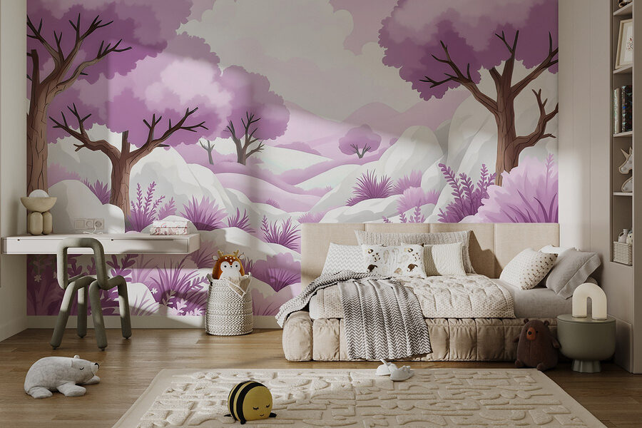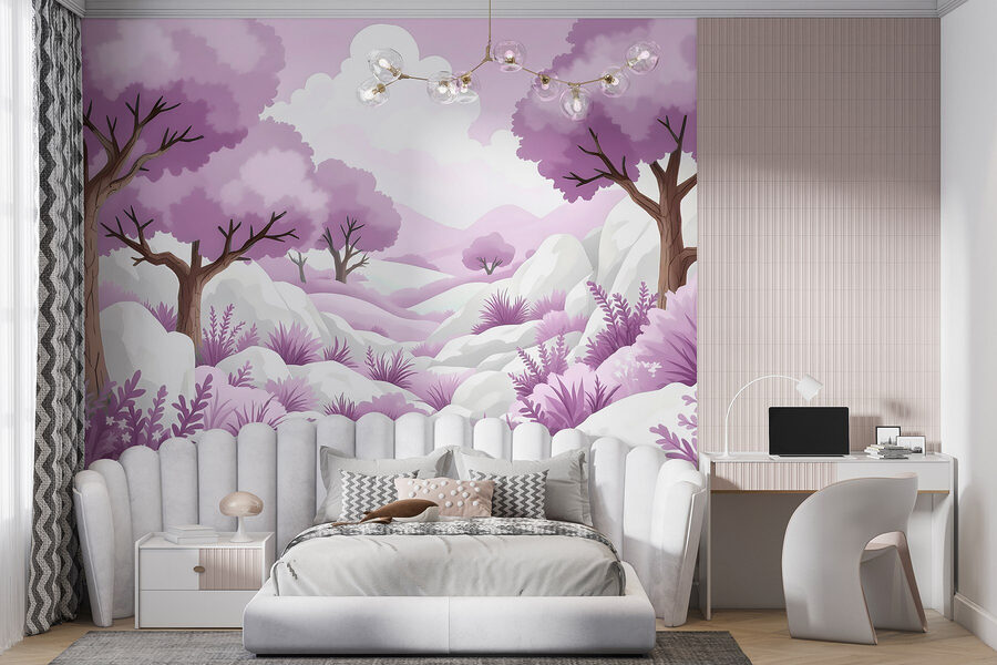 Transformați orice cameră într-un refugiu de vis cu acest fototapet încântător, „Peisaj cu copaci și zăpadă”. Imaginați-vă că pășiți într-o pădure capricioasă, unde copacii de lavandă se leagănă ușor, înconjurați de zăpadă pufoasă și plante delicate. Este ca o lume magică în care iarna se îmbină armonios cu primăvara!