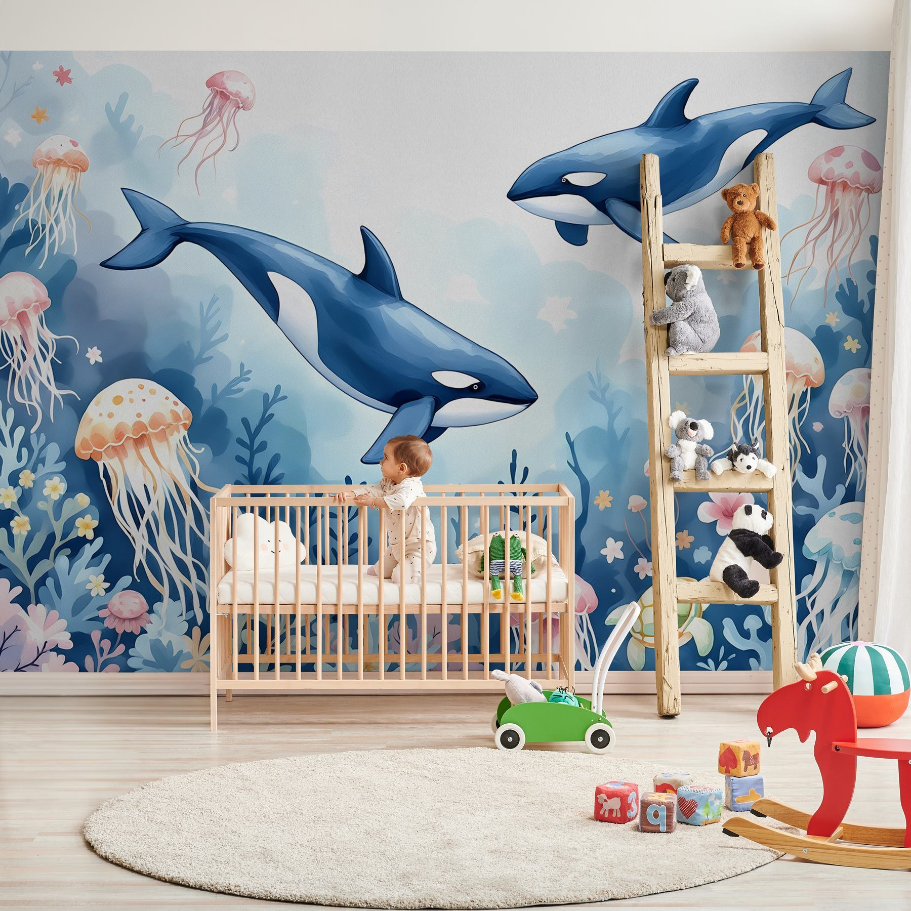 Transformați-vă spațiul într-o lume subacvatică minunată cu acest fototapet încântător, care prezintă balene și o broască țestoasă jucăușă care se zbenguie prin apele vibrante ale oceanului. Imaginați-vă că intrați într-o cameră în care meduzele plutesc leneș, iar coralii colorați se leagănă ca și cum ar dansa. Este ca și cum ați avea propria bucată de mare chiar acasă! Perfect pentru atmosfera de coastă, acest fototapet te va face să visezi cu ochii deschiși la zile petrecute pe plajă și briza oceanului. Cine nu ar zâmbi văzând broaștele țestoase care își văd de treburile lor într-o mare de liniște? Această operă de artă nu este doar un decor; este o invitație de a evada și de a explora – fără a fi nevoie de echipament de scufundări!