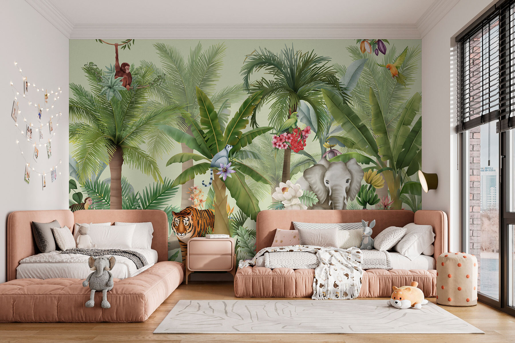 Transform any room into a tropical oasis with this enchanting wall mural featuring playful animals and vibrant flora. Imagine stepping into a lush jungle where a cheeky monkey swings above you and a majestic tiger prowls gracefully—no need for a passport here! The soothing greens can bring calm vibes while the bursts of color from the flowers can spark joy. Perfect for a kids’ room or a quirky living space, it’s like having a mini safari on your walls. Get ready for friends to ask if you’ve just returned from the wild! It’s a fun escape that brings nature right home—minus the mosquitoes.