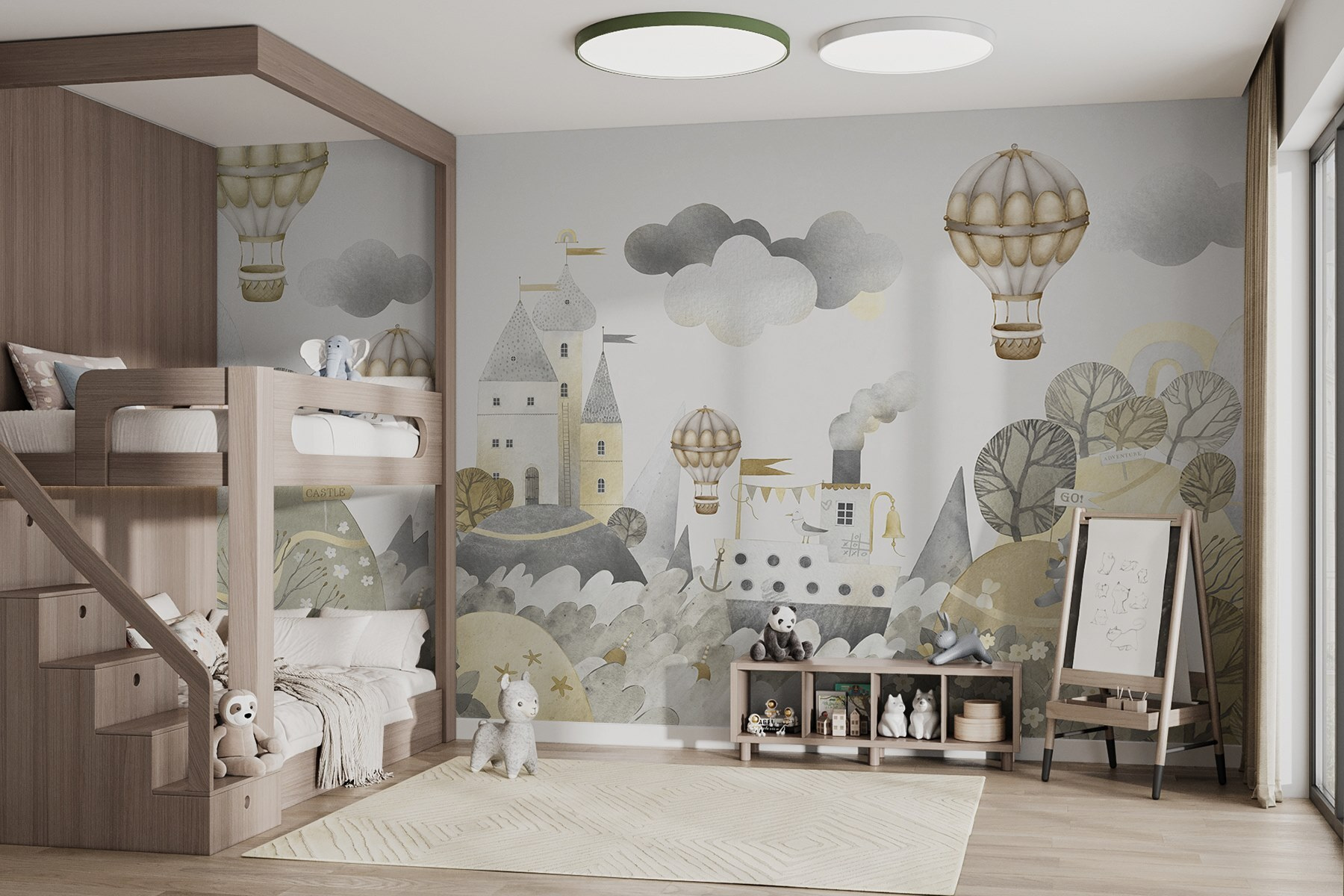 Transformați o cameră într-o aventură fantastică cu acest mural încântător în acuarelă, care prezintă un castel de vis și baloane cu aer cald încântătoare. Imaginați-vă copiii rătăcind prin tărâmurile fermecătoare, imaginația lor zburând la fel de sus ca baloanele. Culorile delicate și detaliile fermecătoare creează o atmosferă confortabilă, dar expansivă, perfectă pentru camere de joacă sau camere pentru copii. Imaginați-vă acele momente liniștite, citind povești sub privirea unui castel prietenos. Veți auzi aproape zumzetul blând al baloanelor și râsetele celor mici în timp ce explorează noul lor regat. Fiecare privire aruncată asupra acestui mural promite o scânteie de bucurie și inspirație. Cine nu ar vrea să se cufunde în acest basm?