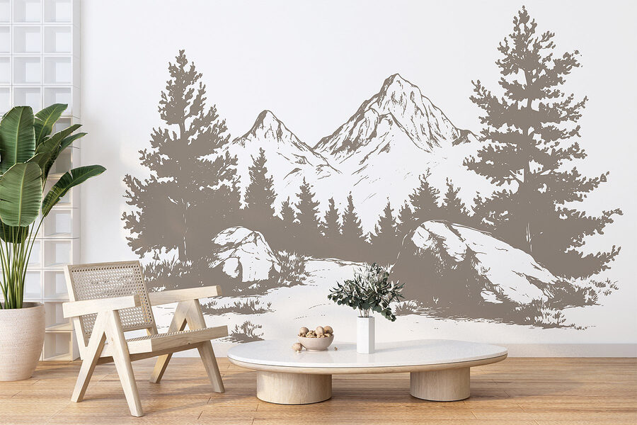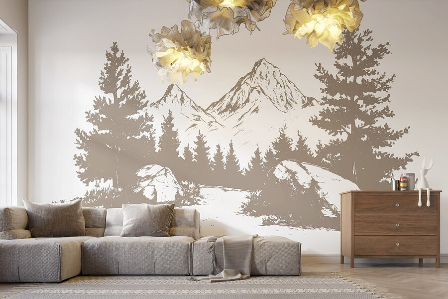 Transformați orice spațiu într-un refugiu confortabil cu această pictură murală care prezintă un lanț muntos senin înconjurat de copaci maiestuoși și stânci robuste. Imaginați-vă sorbind cafeaua dimineața, simțindu-vă ca și cum ați fi cuibărit în natură fără să vă părăsiți casa. Aduce un vibe calm, perfect pentru relaxare după o zi lungă. Tonurile blânde, pământii, înveselesc orice cameră, fiind un decor ideal pentru întâlniri de familie sau seri liniștite cu o carte. În plus, este un bun început de conversație – tuturor le place o priveliște bună. Scufundați-vă în natură și lăsați această pictură murală să vă ducă într-o mică aventură în fiecare zi.