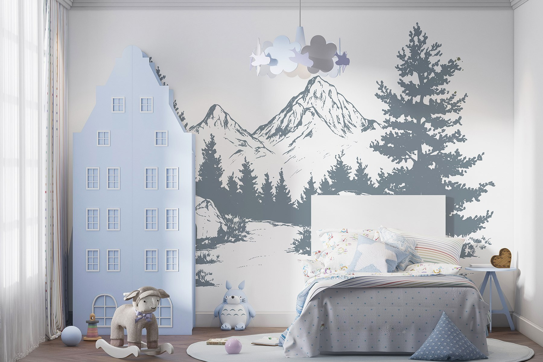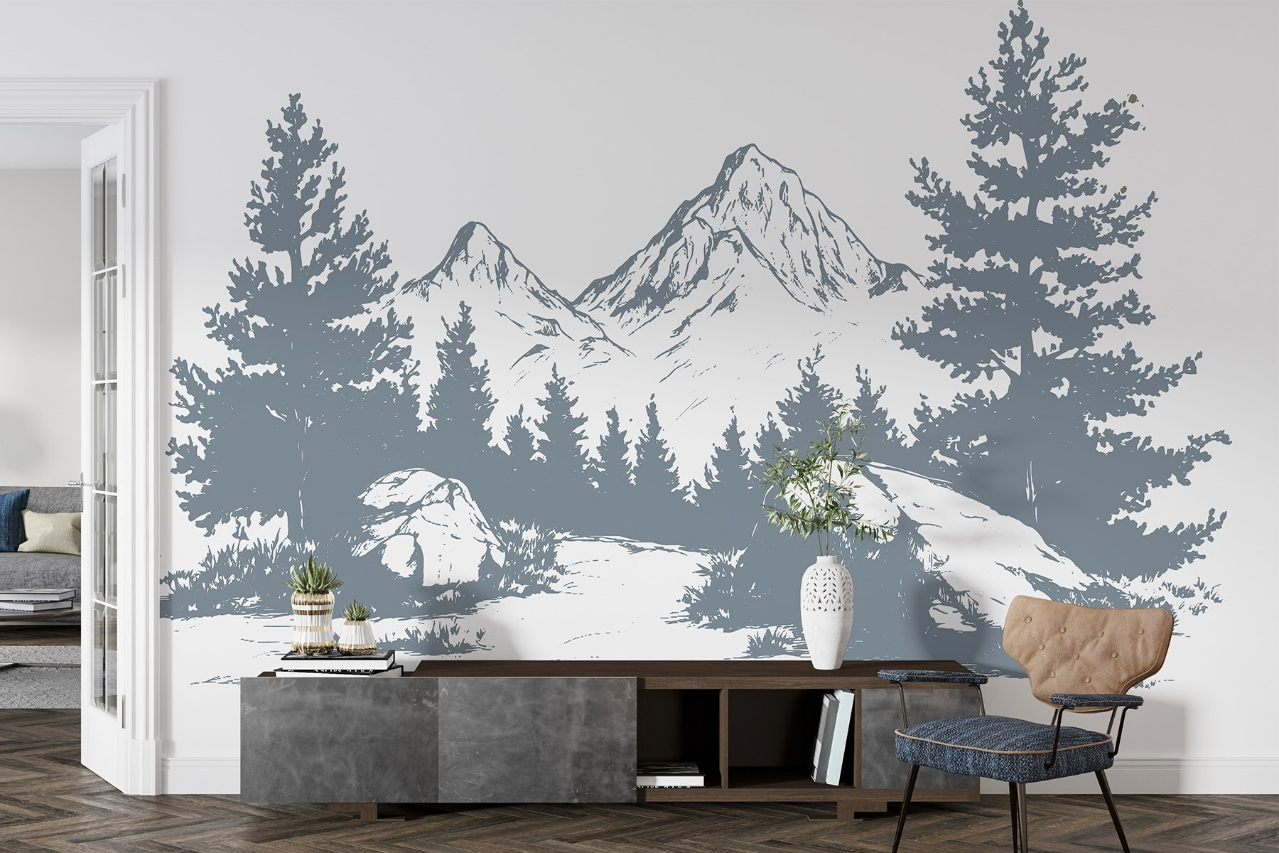 Transformați orice spațiu într-o evadare senină cu această pictură murală a unui lanț muntos maiestuos, înconjurat de copaci luxurianți și stânci aspre. Este ca și cum ai aduce o bucată din marea natură chiar în interior – perfect pentru un colț de lectură confortabil sau pentru acel perete gol la care te-ai holbat, întrebându-te ce să faci cu el. Imaginați-vă sorbind cafea, visând cu ochii deschiși la drumeții chiar pe acești munți. Nuanțele blânde și detaliile complicate vă vor stârni imaginația, făcând ca fiecare privire să se simtă ca o mini evadare. Este natura fără bocanci noroioși – doar calm și stil pur!