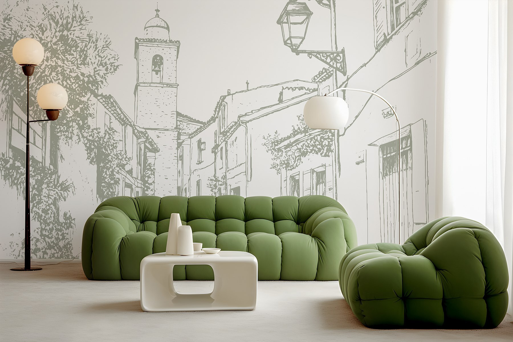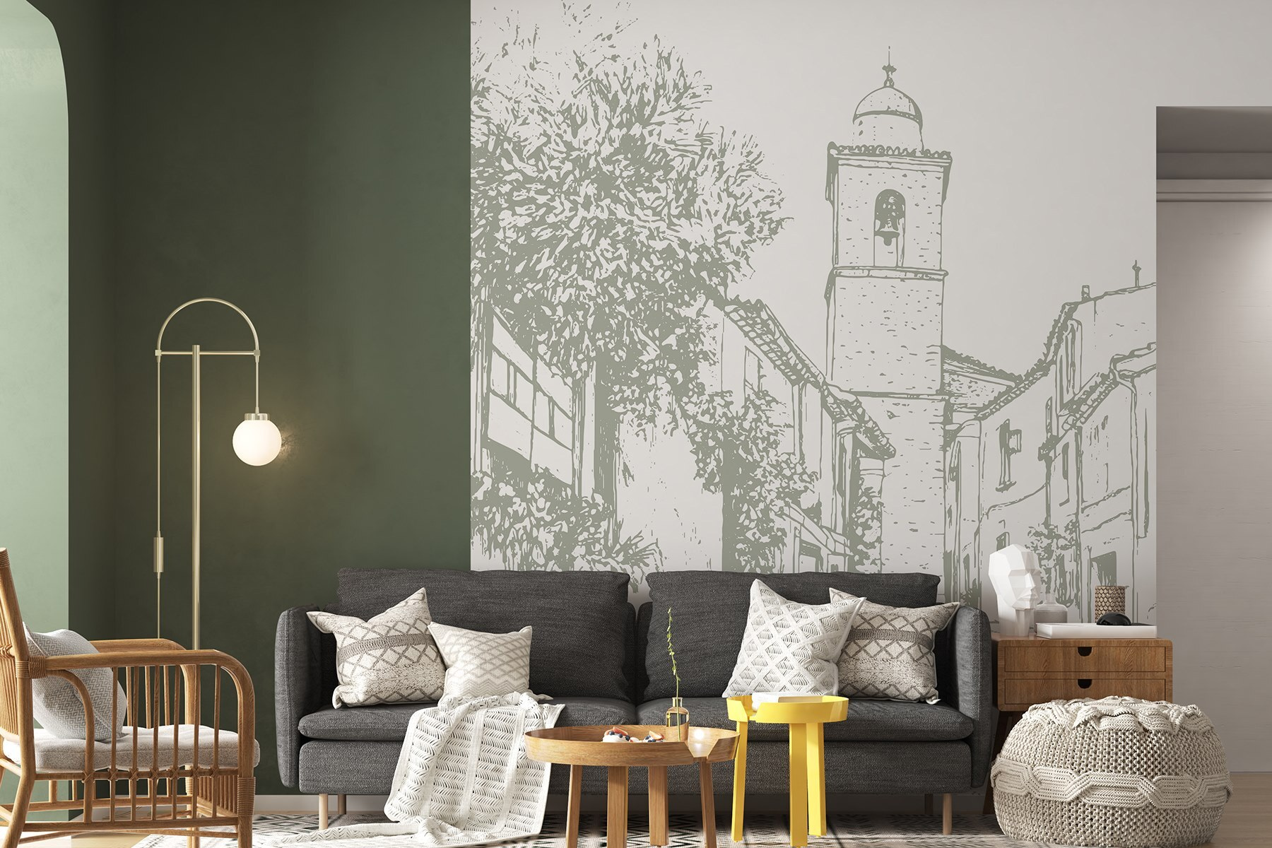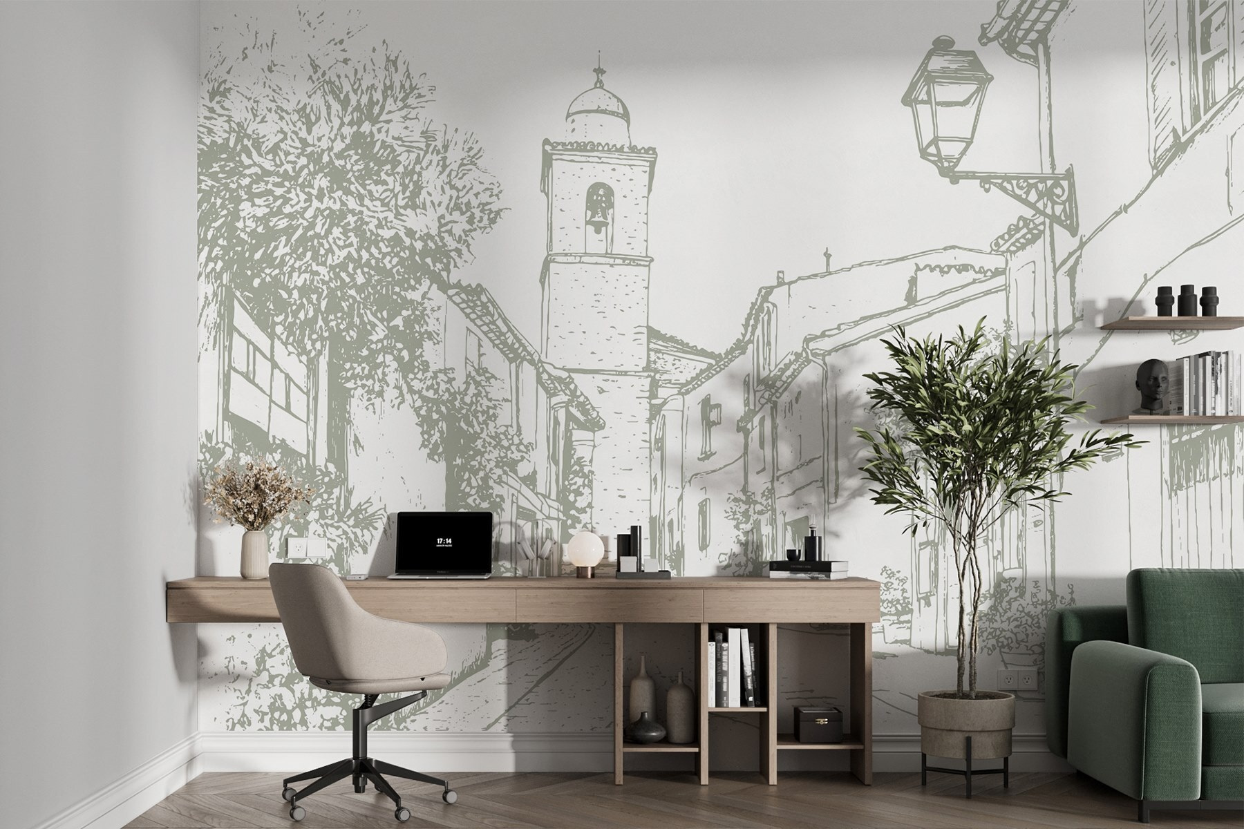 Transformați-vă spațiul cu această pictură murală fermecătoare, o schiță încântătoare a unei străzi pitorești cu un turn clopotniță minunat. Este ca și cum ai păși într-un sat senin de fiecare dată când treci pe acolo. Imaginați-vă sorbind o cafea într-un colț confortabil, cu pereții plini de vibrații pașnice. Contururile delicate ale clădirilor și vegetația luxuriantă aduc un sentiment de calm, perfect pentru relaxare după o zi lungă. Această pictură murală pregătește scena pentru visele cu ochii deschiși despre călătorii și aventură. Lăsați-o să inspire povești și să aducă căldură în orice cameră – pentru că cine nu vrea un strop de fantezie în viața sa?