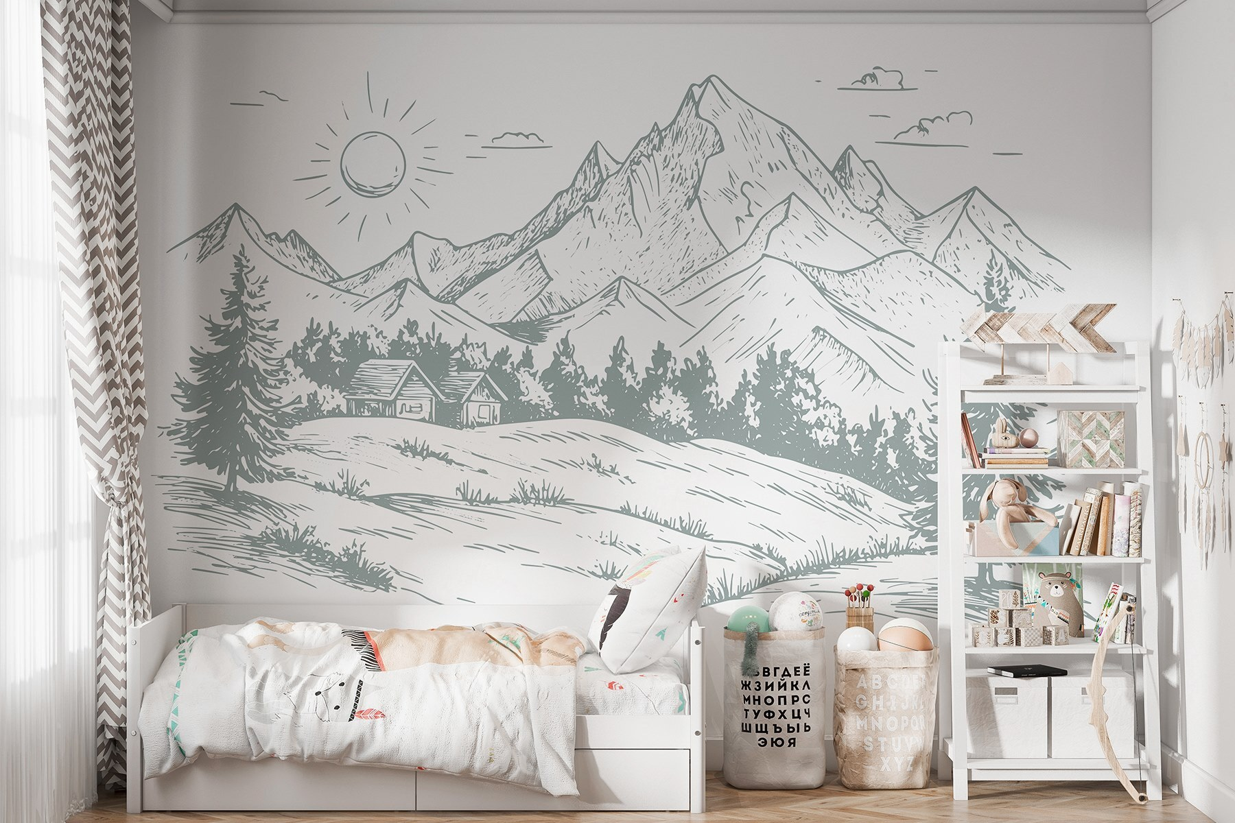 Transformați orice spațiu într-o evadare senină cu această pictură murală care prezintă un peisaj frumos de copaci și munți maiestuoși. Imaginați-vă că vă treziți la contururile moi ale naturii chiar în camera dvs. de zi sau în dormitor – este ca o mini vacanță în fiecare zi. Detaliile subtile și liniile blânde creează un vibe calmant, perfect pentru relaxare după o zi lungă sau pentru inspirarea creativității. Imaginați-vă prieteni care se plimbă înăuntru, cu ochii luminați în timp ce admiră atmosfera proaspătă, de aer liber. Nu este doar decor; este o gură de aer proaspăt pentru pereții dvs.!