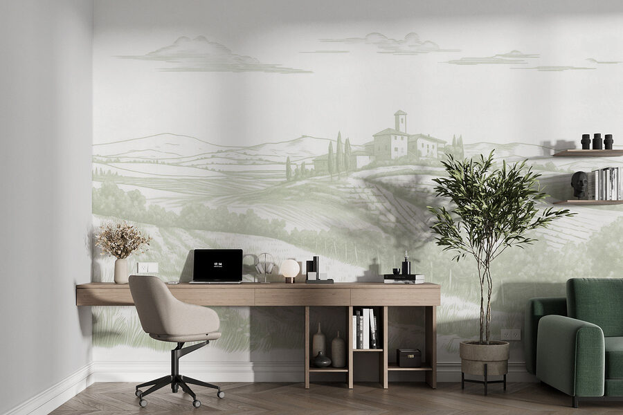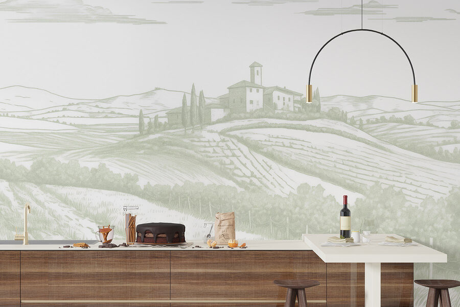 Transformați orice cameră într-o escapadă liniștită cu această frumoasă pictură murală care prezintă un peisaj senin. Imaginați-vă aceste dealuri blânde, o casă fermecătoare care îmbrățișează peisajul, iar câmpurile se întind ca o îmbrățișare caldă. Evocă acea excursie de vis de weekend la țară – perfectă pentru a face ca rutina zilnică să pară mai puțin, ei bine, greoaie. Nuanțele blânde aduc un calm căruia este greu să îi reziști. Este ca și cum ai invita aerul proaspăt și liniștea naturii direct în casa ta, fără alergii și mușcături de insecte. Cine nu și-ar dori o bucățică de paradis la care să se uite în timp ce soarbe cafeaua?