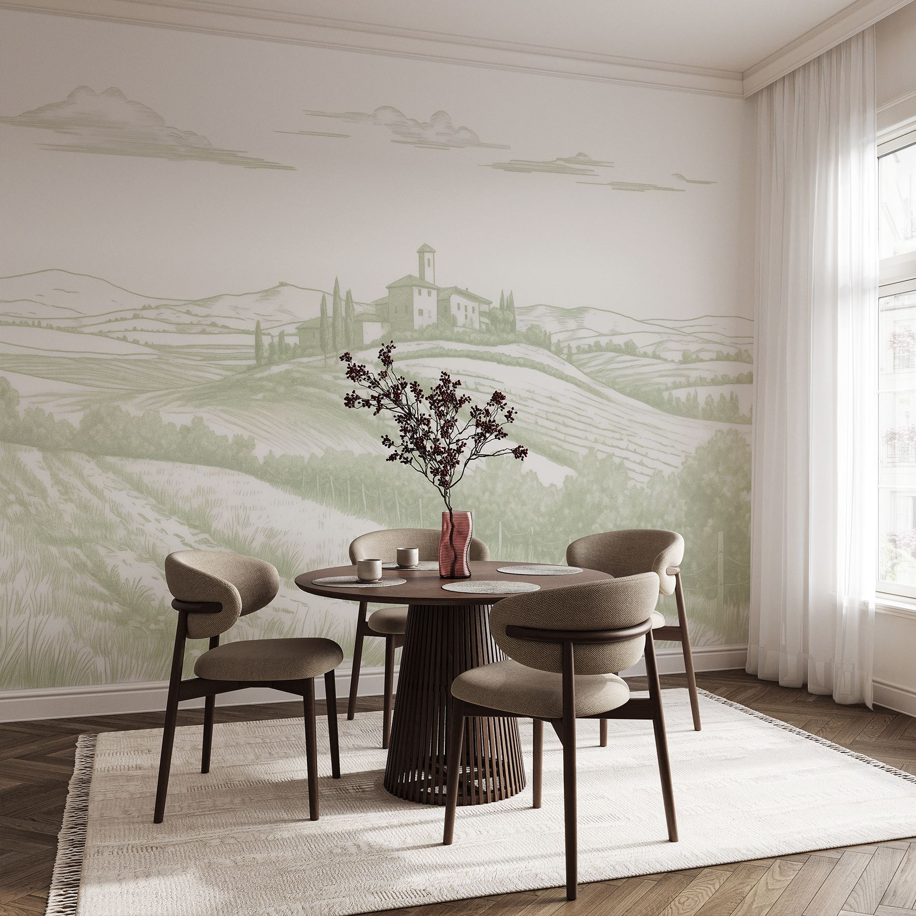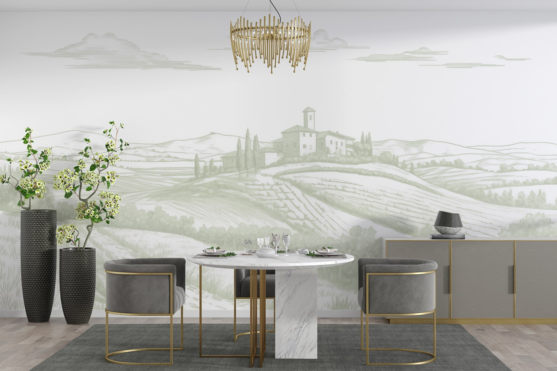 Transformați orice cameră într-o escapadă liniștită cu această frumoasă pictură murală care prezintă un peisaj senin. Imaginați-vă aceste dealuri blânde, o casă fermecătoare care îmbrățișează peisajul, iar câmpurile se întind ca o îmbrățișare caldă. Evocă acea excursie de vis de weekend la țară – perfectă pentru a face ca rutina zilnică să pară mai puțin, ei bine, greoaie. Nuanțele blânde aduc un calm căruia este greu să îi reziști. Este ca și cum ai invita aerul proaspăt și liniștea naturii direct în casa ta, fără alergii și mușcături de insecte. Cine nu și-ar dori o bucățică de paradis la care să se uite în timp ce soarbe cafeaua?