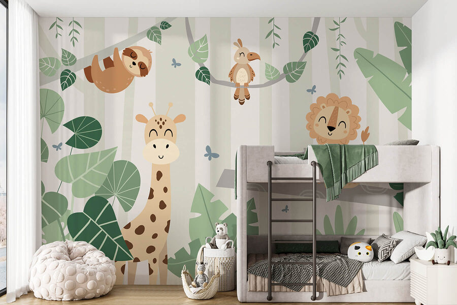 Transformați orice spațiu cu această pictură murală încântătoare din junglă, cu o distribuție fermecătoare de personaje animale, inclusiv o girafă veselă, o lene relaxată și un leu jucăuș. Este ca și cum ați păși într-un paradis jucăuș de fiecare dată când intrați în cameră. Imaginați-vă copiii chicotind în timp ce sunt înconjurați de verdeață luxuriantă și de prietenii lor blănoși – s-ar putea chiar să pretindă că sunt exploratori într-un safari captivant! Fiecare detaliu aduce un sentiment de distracție și mirare, perfect pentru a stârni imaginația. Această pictură murală nu numai că luminează pereții, dar aduce și o atmosferă lipsită de griji la ora de joacă, la ora de culcare sau oricând. Cine nu și-ar dori propriul refugiu în junglă la el acasă?