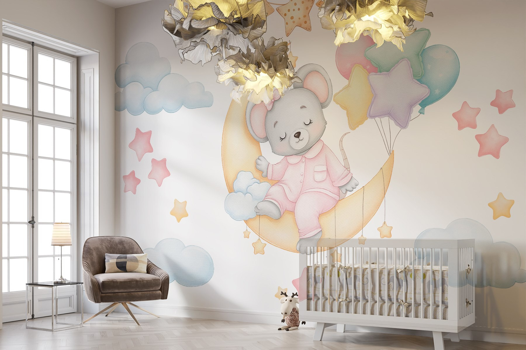 Transformați orice cameră într-o evadare de vis cu această pictură murală încântătoare, care prezintă un șoricel așezat pe lună, strângând baloane colorate. Imaginați-vă o strălucire blândă care luminează aceste stele mici, în timp ce micuțul dvs. adoarme, visând la aventuri capricioase printre nori. Este ca o poveste de adormit copiii care prinde viață – perfectă pentru grădinițe sau camere de joacă! Paleta pastel creează o atmosferă liniștitoare, făcând ușor de imaginat toate chicotelile și visele dulci pe care această scenă fermecătoare le-ar putea inspira. Adăugați un strop de magie pereților și lăsați imaginația să zboare!