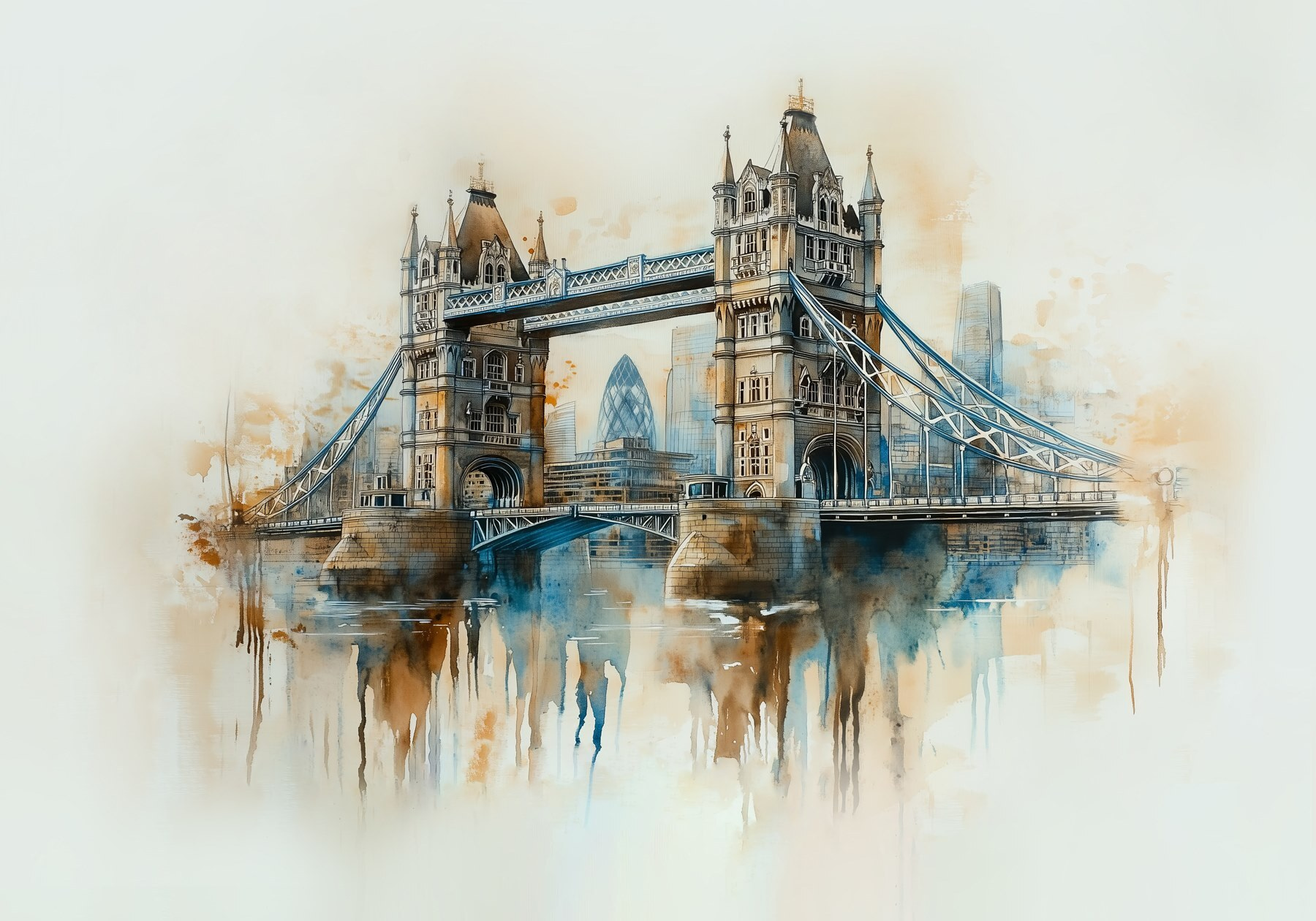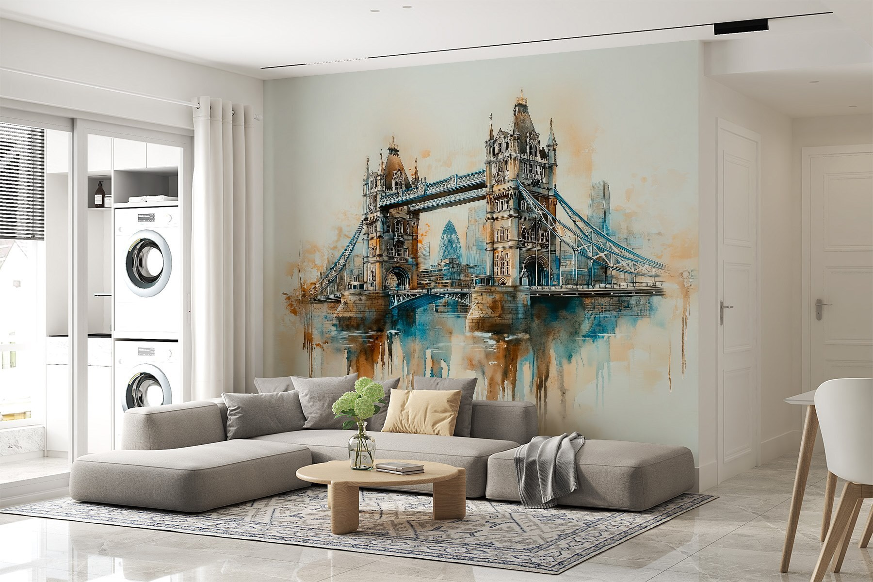 Transformați-vă spațiul cu această pictură murală uimitoare în acuarelă a unui pod, o aluzie încântătoare la viața urbană. Imaginați-vă acest lucru: pășiți în camera dvs. și sunteți întâmpinați de o scenă senină, de vis, care îmbină fără efort culorile și captează farmecul peisajelor urbane. Este ca o mini-vacanță de fiecare dată când treceți pe aici!