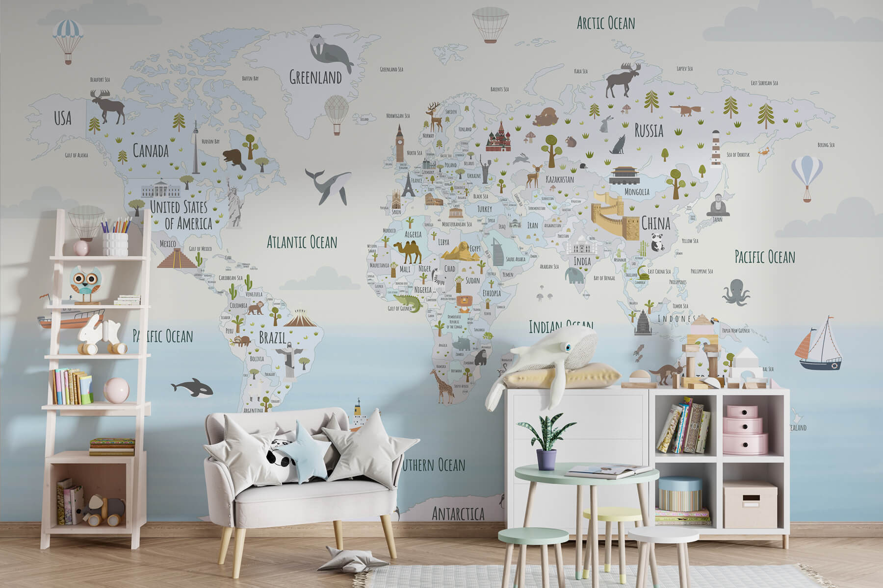 Transformați orice spațiu cu această pictură murală încântătoare care prezintă o hartă colorată a lumii presărată cu animale fermecătoare. Perfectă pentru copiii curioși sau pentru toți cei tineri la suflet, aceasta stârnește imaginația și aventura. Imaginați-vă doar un micuț arătându-și creaturile preferate în timp ce visează la ținuturi îndepărtate – magie pură! Nuanțele suave creează o atmosferă relaxantă, ideală pentru dormitoare sau camere de joacă. Este ca o invitație deschisă la explorare, învățare și visare cu ochii deschiși despre călătorii sălbatice. O piesă centrală uimitoare care aduce pereții la viață, făcând din fiecare privire o mică călătorie!