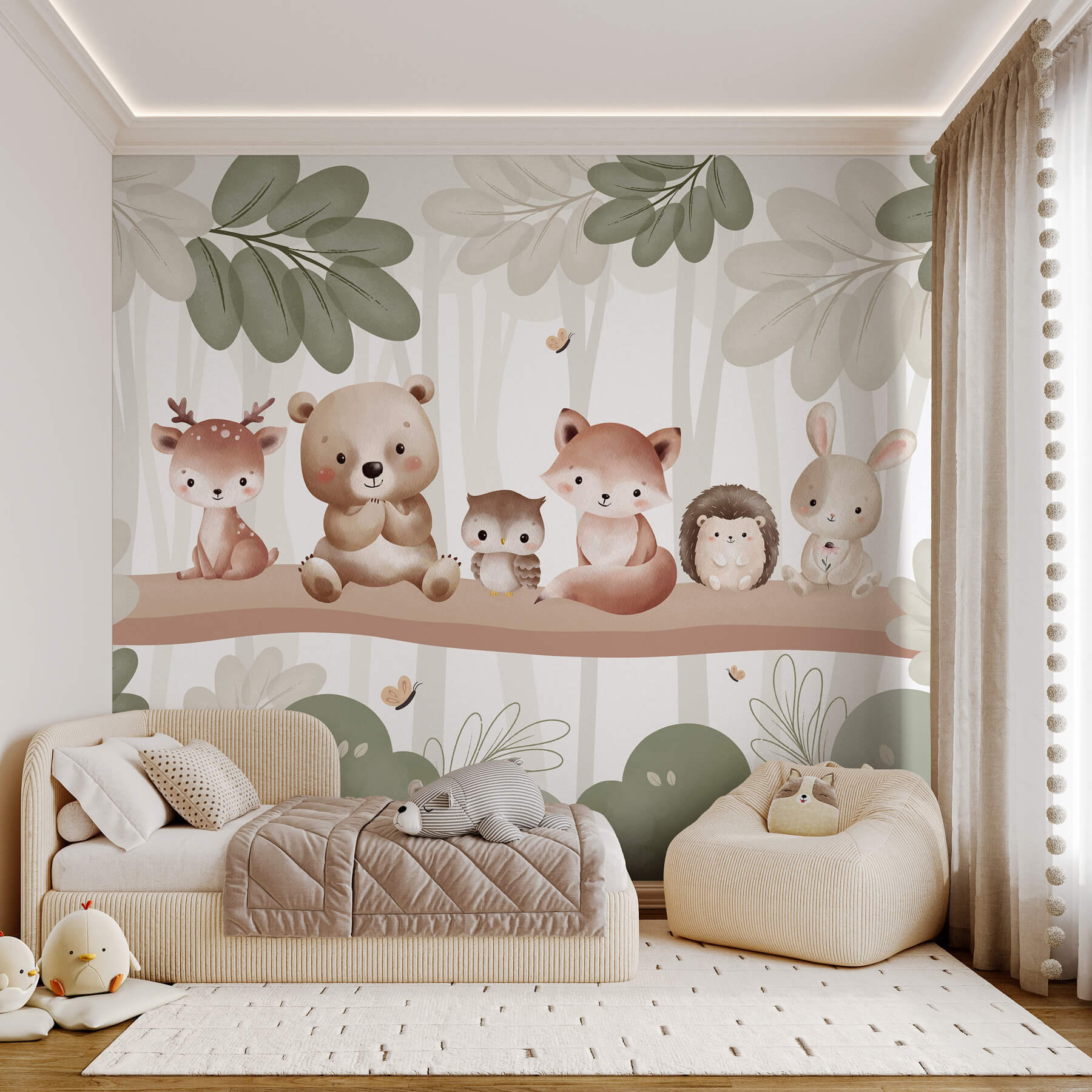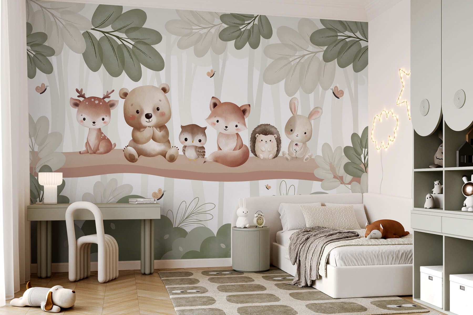 Imaginați-vă un colțișor confortabil plin de farmecul unui tărâm al minunilor din pădure. Această pictură murală încântătoare prezintă o echipă adorabilă de prieteni animale cocoțați pe o creangă, gata să aducă un strop de fantezie în orice spațiu. Imaginați-vă o căprioară timidă, un urs curios și o vulpe jucăușă, toate așezate printre frunze verzi. Este decorul perfect pentru camera unui copil, stârnind povești despre aventuri în pădurea magică. Fiecare privire invită la chicoteli și imaginație, creând o căldură care te învăluie ca o pătură preferată. Transformă obișnuitul în ceva cu adevărat special cu acești simpatici prieteni din pădure!