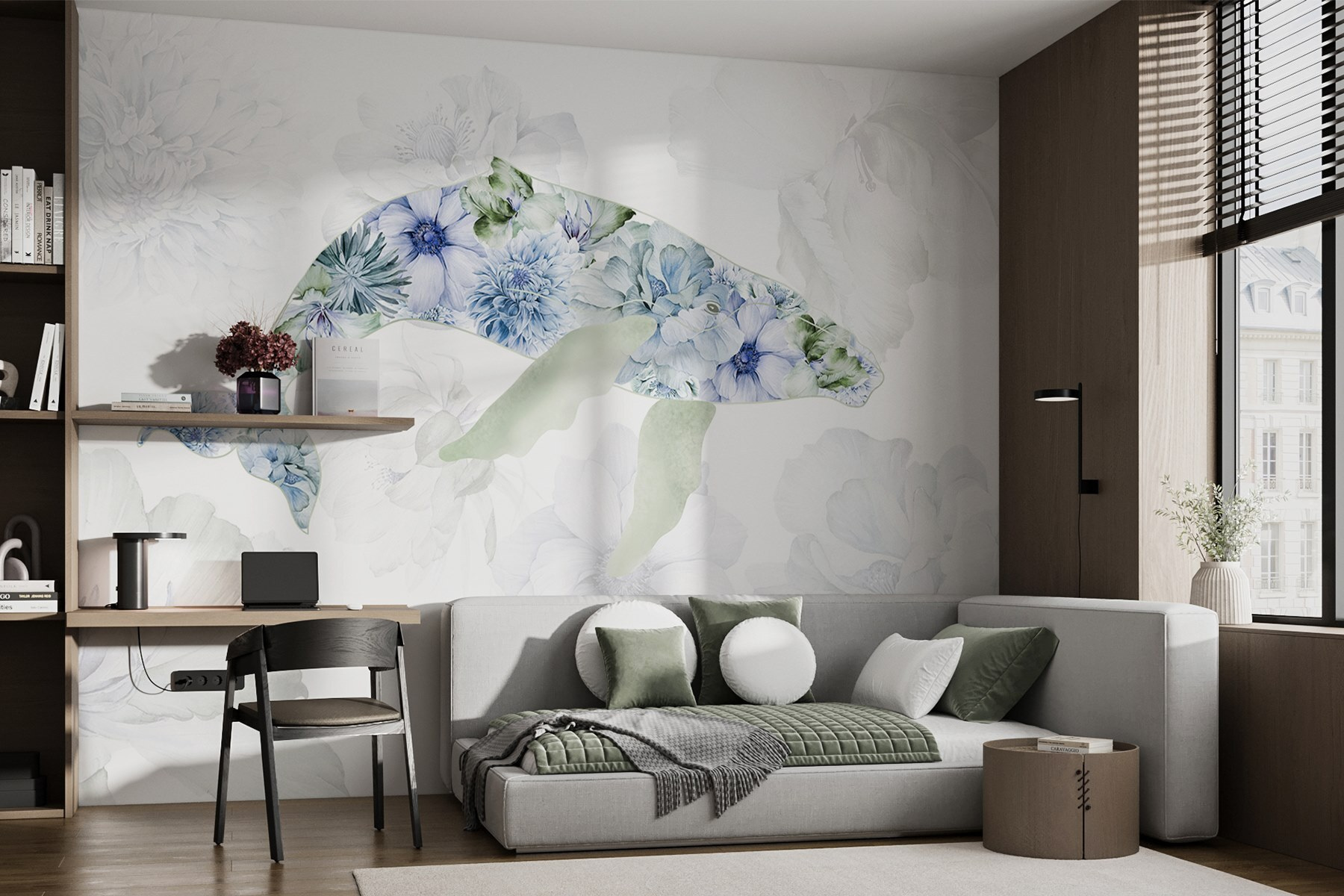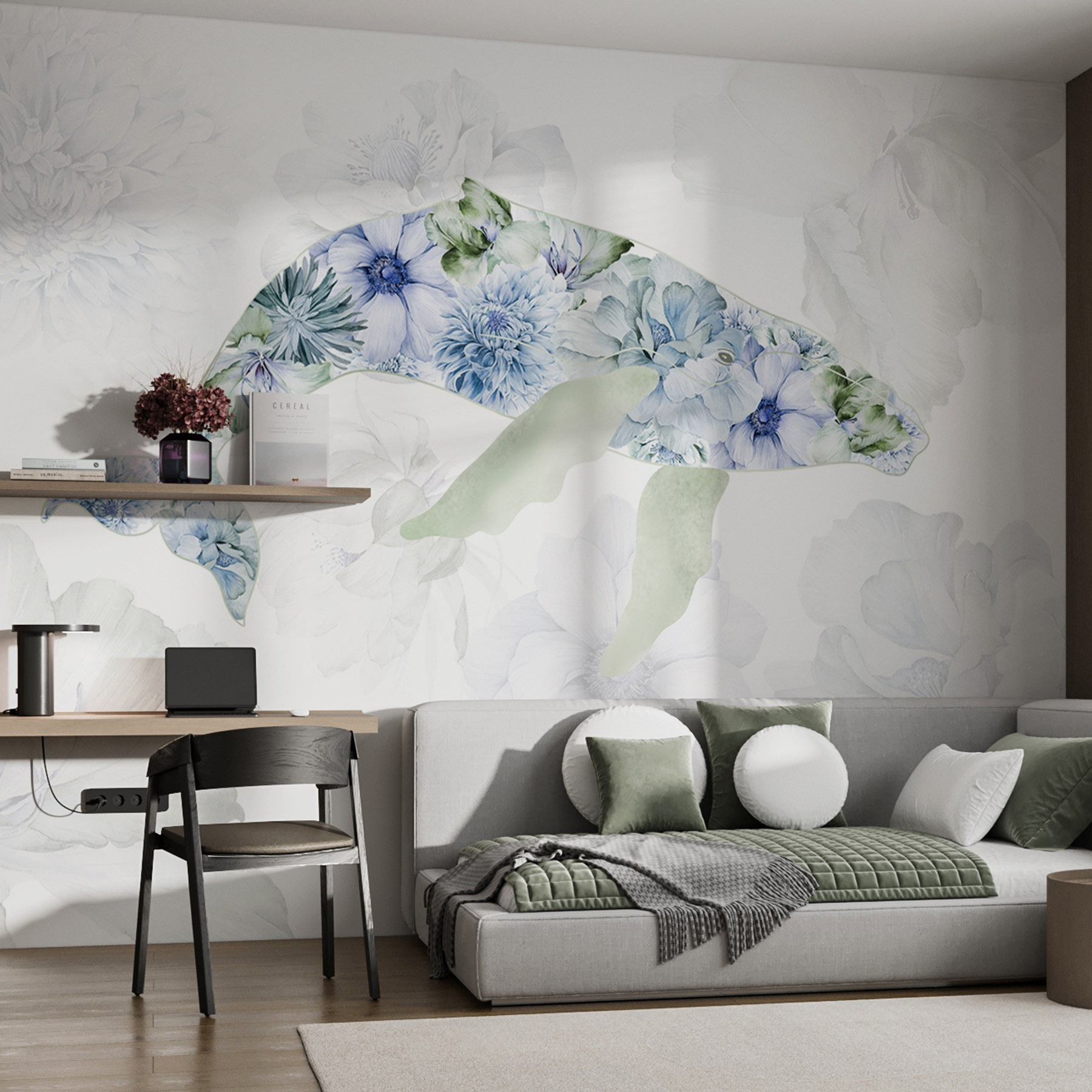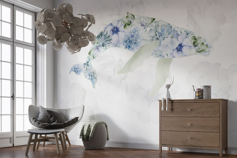 Transformați-vă spațiul cu această pictură murală încântătoare cu o balenă plină de flori jucăușe. Imaginați-vă că pășiți într-o cameră și simțiți instantaneu calmul mării și fantezia unei grădini. Nuanțele blânde și petalele delicate invită la o atmosferă blândă, senină, perfectă pentru un colț de lectură confortabil sau chiar pentru o cameră de copil jucăușă. Este ca și cum ai avea o bucată de natură chiar pe perete, capturând bucuria vieții oceanice și a frumuseții florale. Imaginează-ți prietenii admirând-o și întrebând unde ai găsit o astfel de bijuterie. Imersați-vă și lăsați pictura murală să insufle viață pereților dumneavoastră!