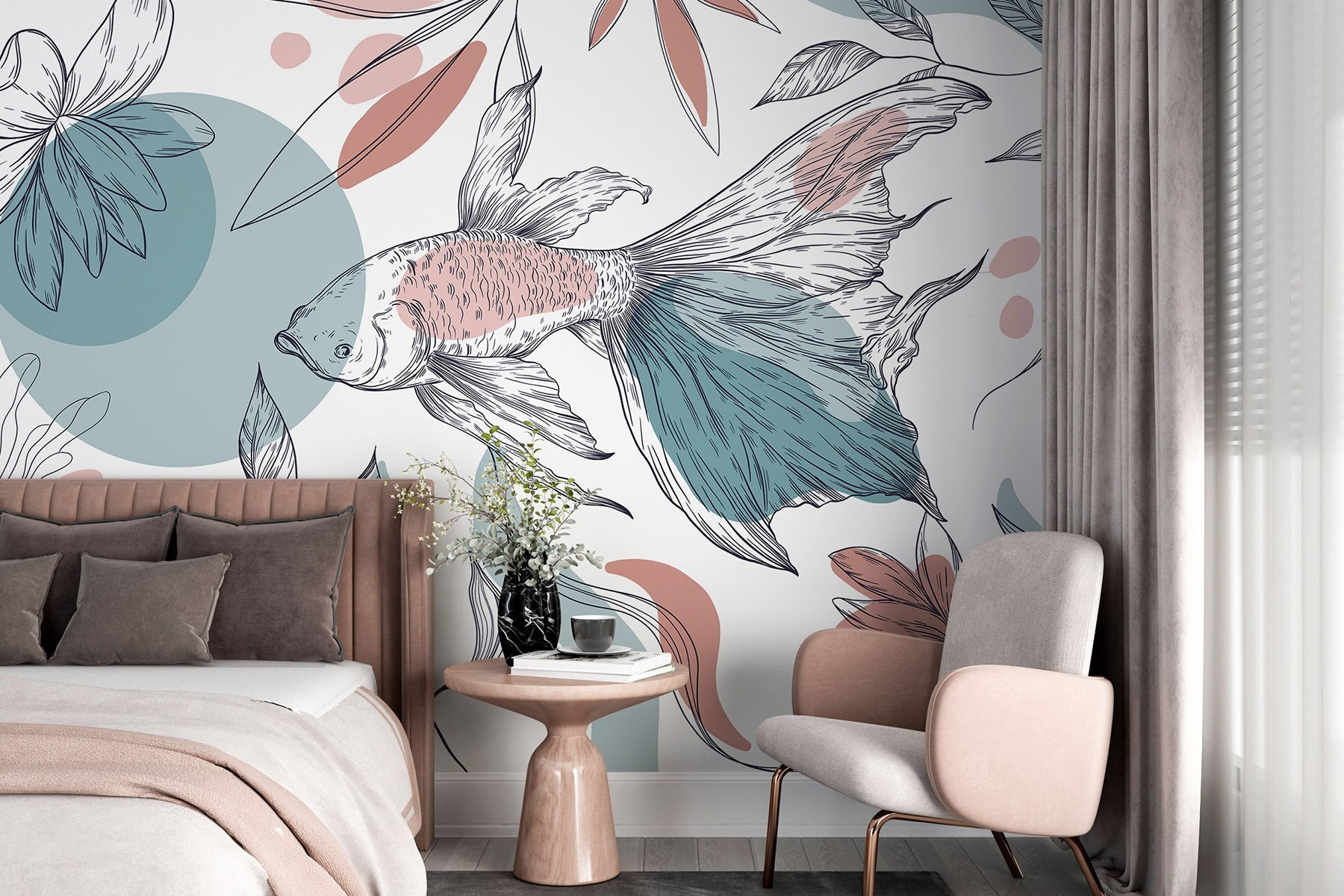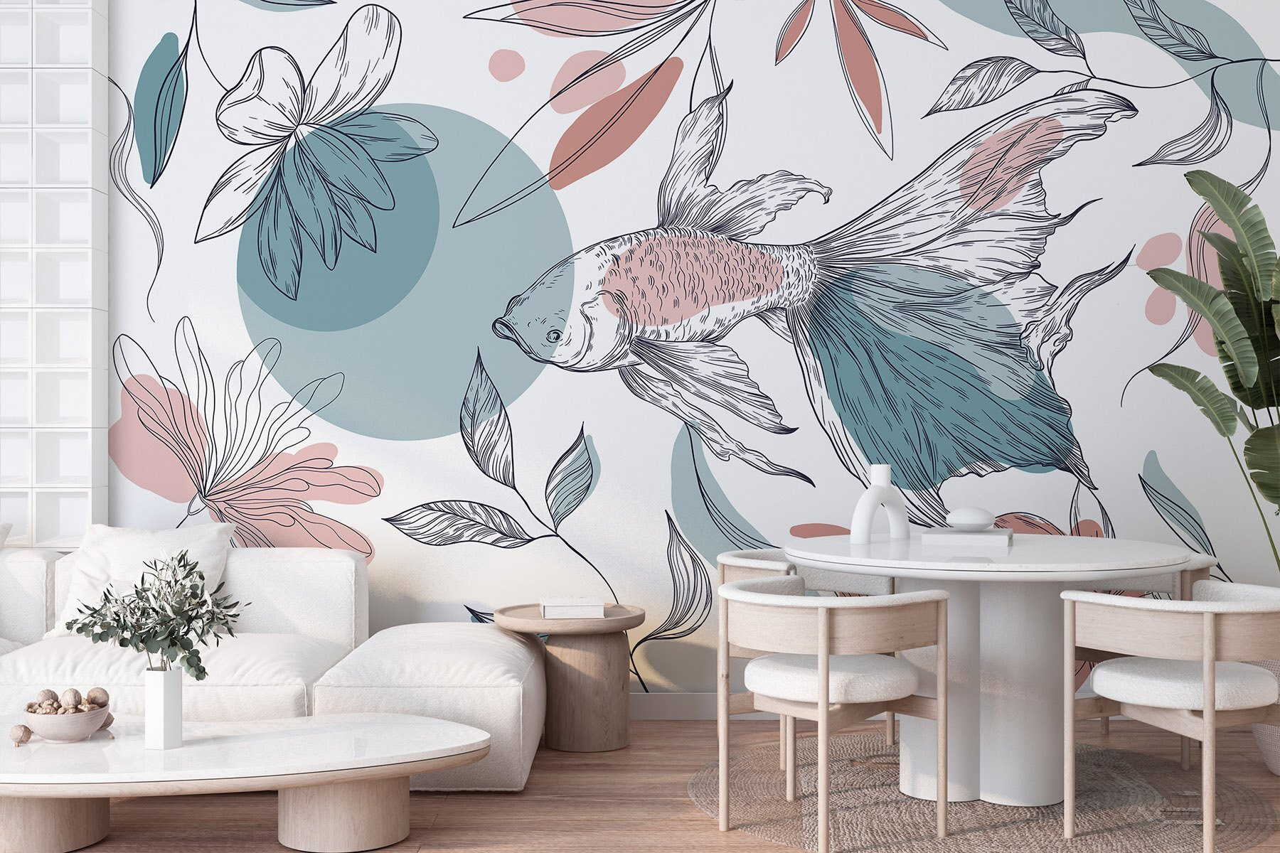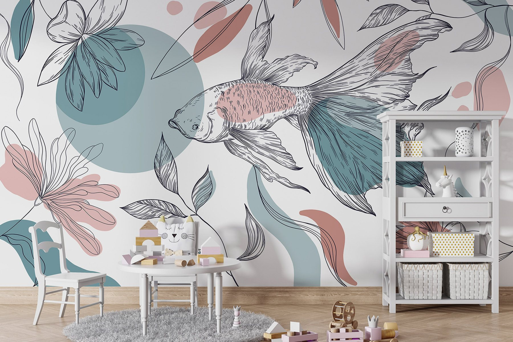 Aduceți un strop de farmec în orice spațiu cu această pictură murală încântătoare cu pești și plante care dansează jucăuș printre cercuri și puncte. Se simte ca o grădină subacvatică senină – imaginați-vă că pășiți în cafeneaua dvs. confortabilă preferată sau într-un refugiu natural pașnic, totul din confortul casei. Nuanțele acuarelei sunt moi, dar suficient de vibrante pentru a stârni bucurie de fiecare dată când treceți pe acolo. Imaginează-ți că te relaxezi cu o carte, lumina soarelui pătrunzând înăuntru, iar acei peștișori alunecă grațios pe perete, adăugând atingerea potrivită de fantezie. Pereții tăi merită un pic de distracție, nu crezi?