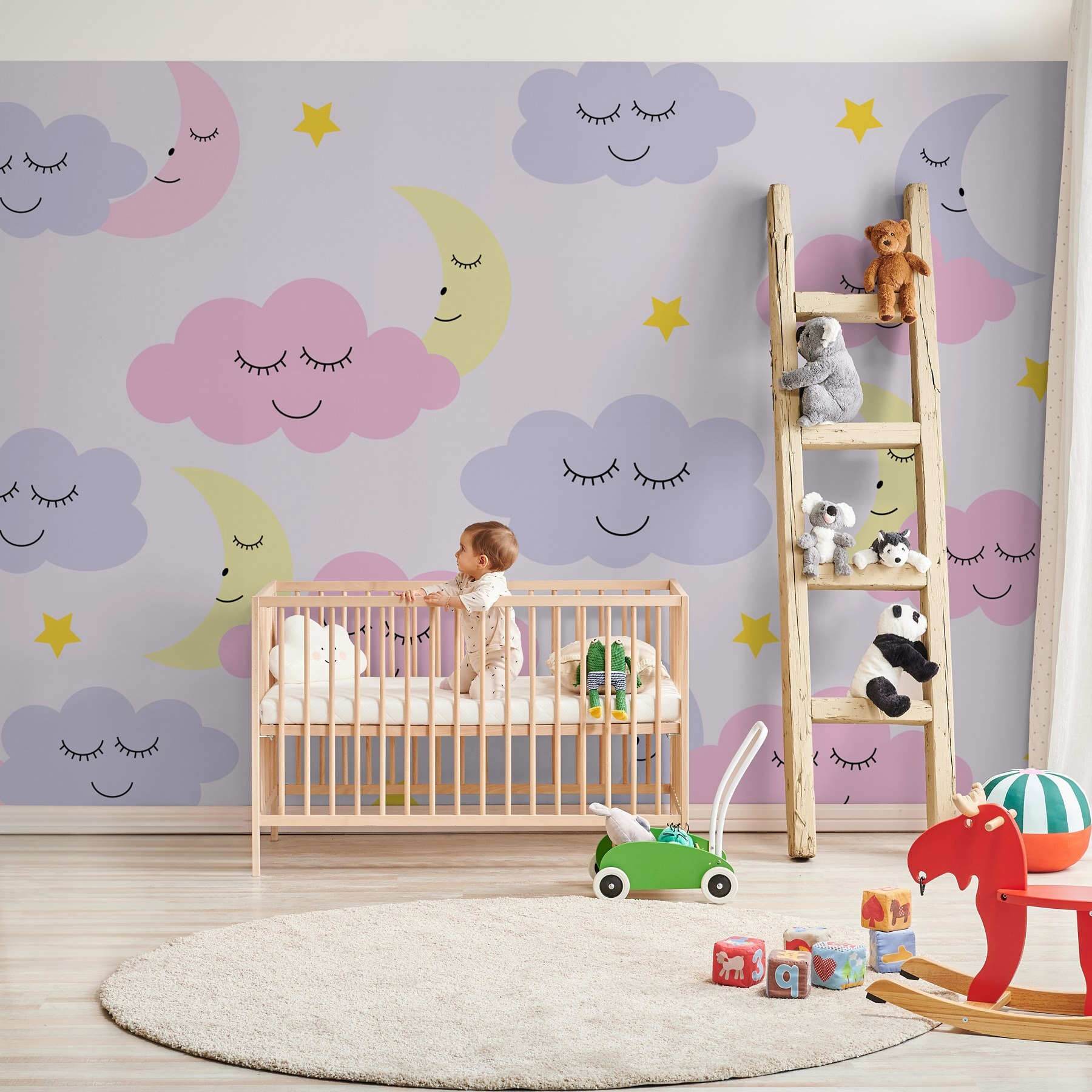 Transformați spațiul oricărui micuț într-un sanctuar de vis cu această pictură murală adorabilă cu nori veseli, stele jucăușe și luni adormite. Este ca și cum cerul nopții a primit o transformare veselă! Imaginați-vă zâmbetele din timpul orei de povești, în timp ce copiii se întind sub nori pufoși roz și mov, visând vise plăcute. Fiecare element se simte ca o îmbrățișare caldă, invitând imaginația și mirarea. Perfect pentru camera copilului sau camera de joacă, nu este doar un decor; este o evadare confortabilă unde visele își iau zborul și aventurile încep. Cine nu și-ar dori să adoarmă în această scenă minunată?