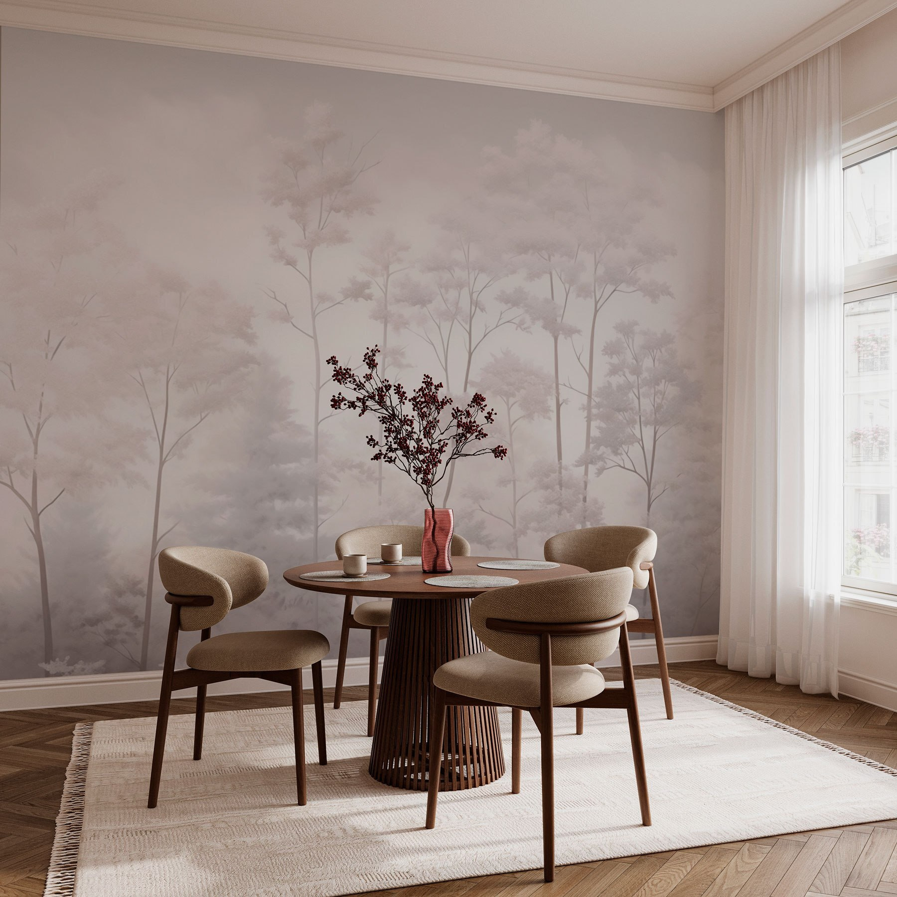 Transformați-vă spațiul cu farmecul senin al acestei picturi murale care înfățișează un grup de copaci învăluiți într-o ceață blândă. Imaginați-vă că pășiți într-o pădure de vis de fiecare dată când treceți pe lângă ea. Tonurile blânde și atmosfera încețoșată creează un vibe calmant – perfect pentru relaxare după o zi lungă sau pentru a adăuga o notă de natură casei dvs. Este ca și cum ai avea o evadare liniștită chiar pe peretele tău. În plus, stârnește o conversație grozavă! Prietenii vor fi încântați de alegerea ta decorativă unică. Cine ar fi crezut că o grămadă de copaci poate fi atât de captivantă?