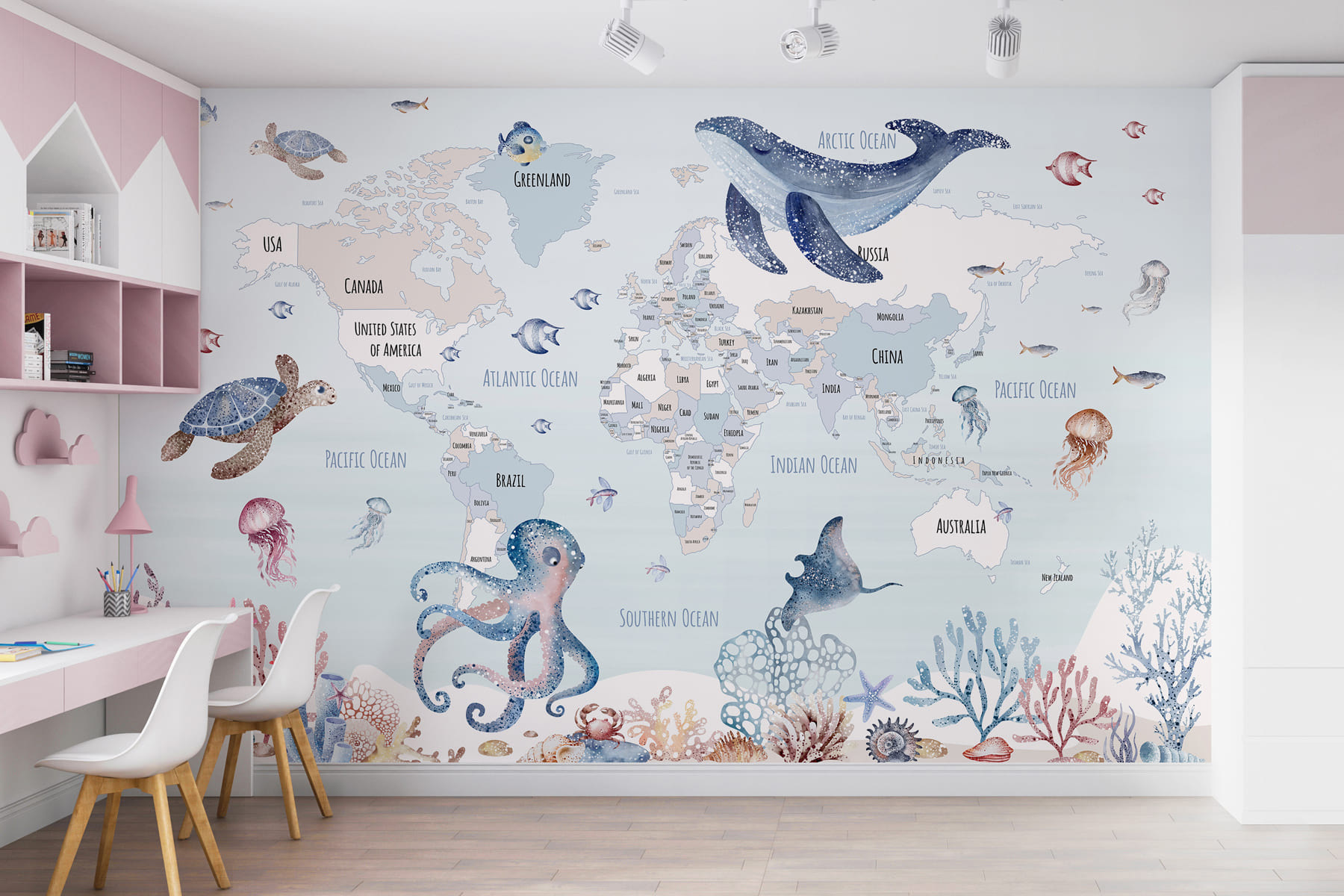 Transformați un perete simplu într-o aventură vibrantă cu această încântătoare “Fototapet Map of the World with Sea Animals”. Este ca și cum ați face o plimbare pe sub mare fără să vă udați picioarele! Perfectă pentru copii, sau pentru oricine este încă un copil în suflet, această pictură murală adaugă un strop de culoare și curiozitate în orice cameră. Imaginați-vă acei ochișori curioși luminându-se în timp ce observă o meduză aici și o țestoasă acolo. Nu este doar decor; stârnește imaginația și mirarea. Imaginați-vă – un colț de lectură confortabil sau o zonă de joacă, unde fiecare privire la perete inspiră vise de escapade oceanice. Este distractiv, este educativ și poate chiar stârni un pic de dorință de a călători. De ce să nu invitați oceanul direct într-un spațiu preferat?