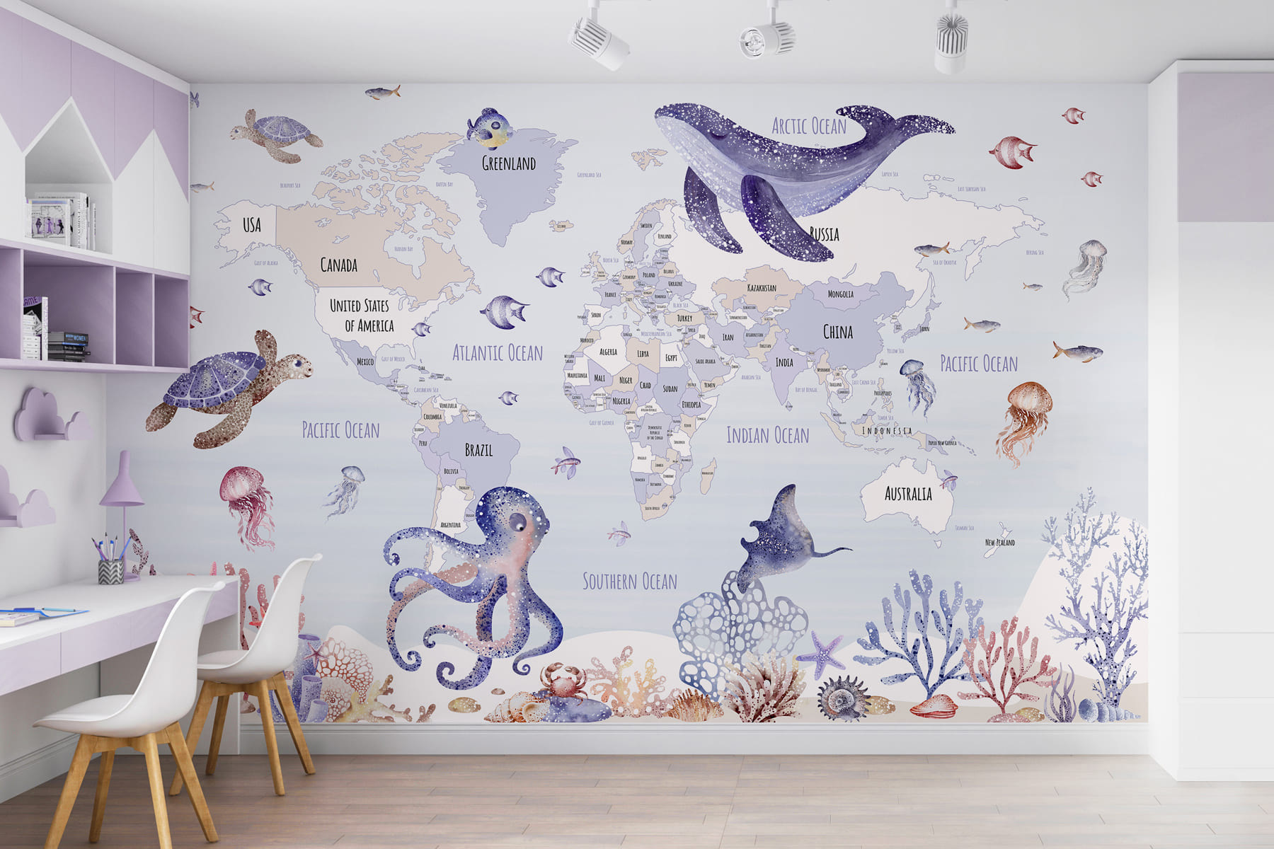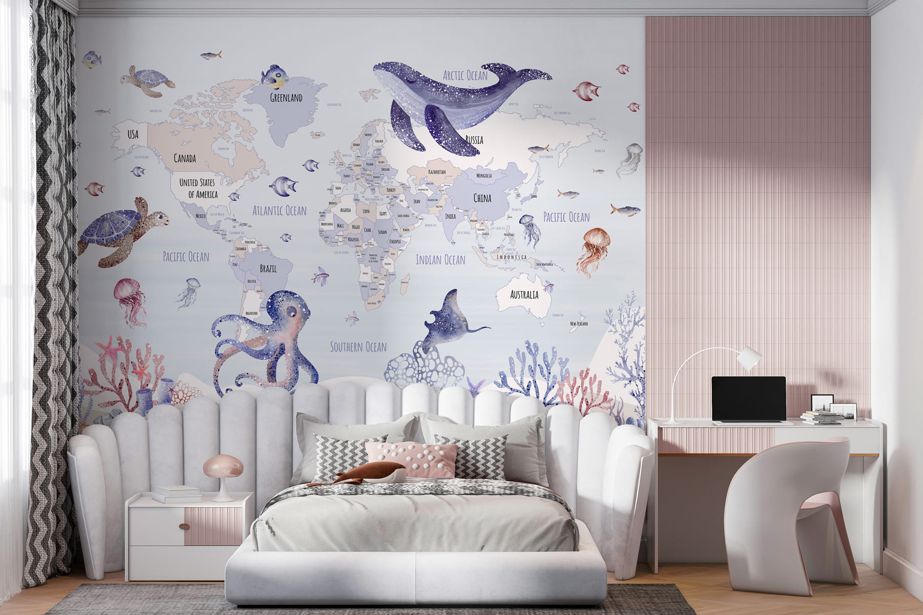 Transformați orice cameră într-o aventură în miniatură cu această pictură murală încântătoare, care prezintă o hartă fermecătoare a lumii învăluită într-un strop de viață marină. Imaginați-vă zâmbetele pe care le va aduce, invitându-vă micii exploratori să învețe despre ținuturi îndepărtate în timp ce sunt înconjurați de țestoase capricioase, caracatițe jucăușe și balene blânde. Nu este doar o pictură murală; este ca și cum ai avea propria ta poveste cu tematică oceanică care așteaptă să se desfășoare. Perfectă pentru camerele de joacă sau pentru colțurile confortabile, va stârni curiozitatea, va aprinde imaginația și poate chiar va transforma o zi de marți plictisitoare într-un vis de zi sub mare. Cine știe, aceasta ar putea inspira un viitor biolog marin!