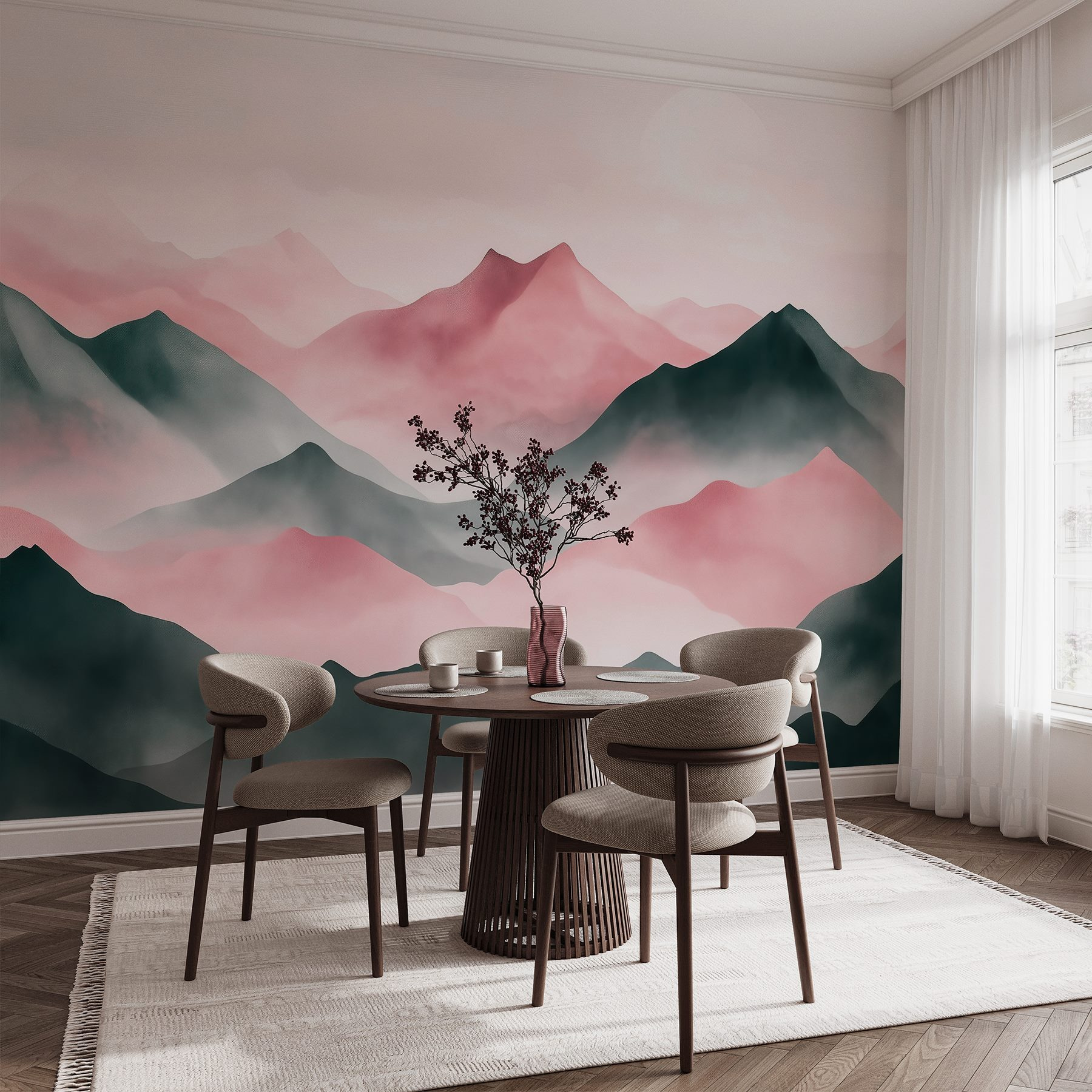 Transformați orice spațiu cu această pictură murală de vis cu un lanț muntos învăluit în ceață moale. Imaginați-vă că vă treziți într-o cameră care se simte ca o evadare confortabilă în aer liber – cât de frumos ar fi asta? Nuanțele blânde de roz și gri evocă o atmosferă calmă, perfectă pentru acele momente în care aveți nevoie să respirați și să vă relaxați. Imaginați-vă sorbind cafea, admirând priveliștea și simțind cum greutatea lumii se îndepărtează. Această pictură murală este ca și cum ai aduce o bucată de natură în casă, oferind un fundal senin pentru viața de zi cu zi sau pentru serile liniștite. Este acea atingere de magie de care are nevoie orice spațiu.