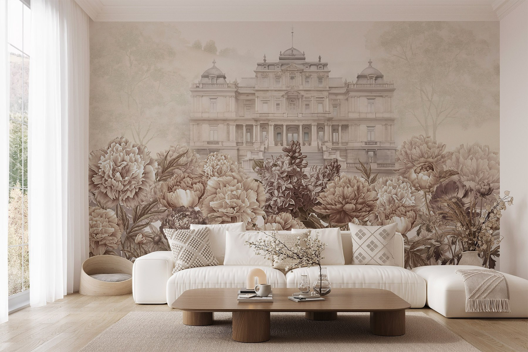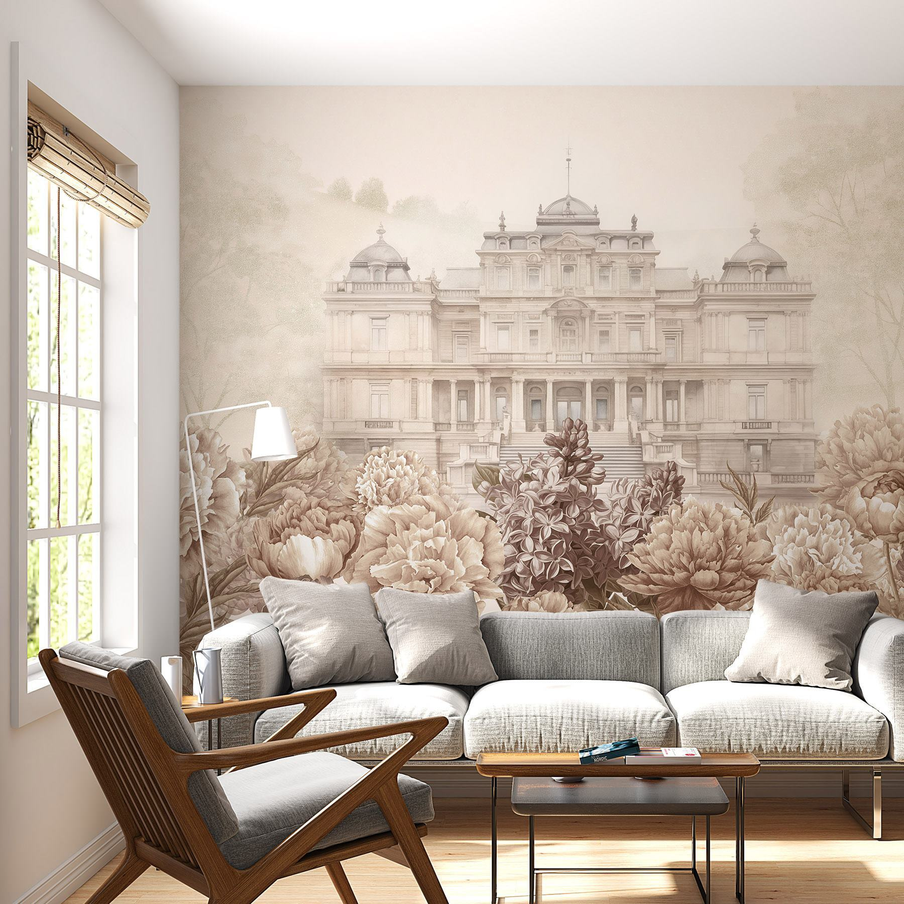 Aduceți un suflu de seninătate spațiului dvs. cu această pictură murală uimitoare. Acesta prezintă o clădire albă grandioasă îmbrăcată cu flori delicate, creând un fundal de vis, elegant și primitor deopotrivă. Imaginați-vă că intrați într-o cameră în care farmecul bujorilor și al liliacului vă ridică instantaneu moralul. Este ca și cum ați evada într-o grădină liniștită de fiecare dată când pășiți înăuntru. Perfectă pentru o cameră de zi sau chiar pentru un colțișor de lectură confortabil, această pictură murală șoptește rafinament, simțindu-se în același timp caldă și accesibilă. Gândiți-vă doar la toate complimentele pe care prietenii le vor primi când vor vedea această frumusețe – vorbesc despre un început de conversație!