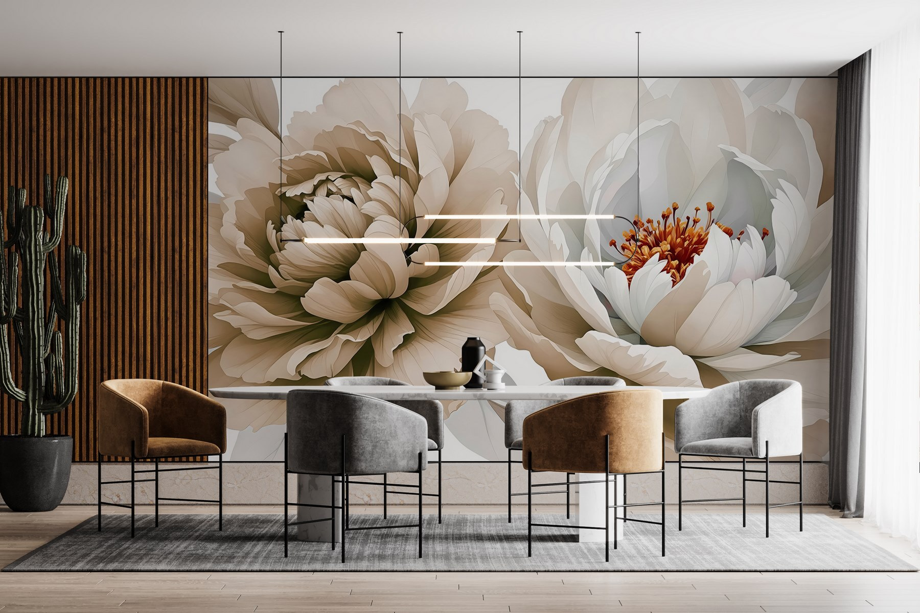 Transformați-vă spațiul cu o notă de eleganță. Pictura murală “Elegant Blooms in Soft Hues” aduce un vibe moale, de vis direct în orice cameră. Imaginați-vă că vă treziți în fața acestor flori uimitoare, culorile lor blânde șoptindu-vă calm. Este ca și cum ai avea o grădină secretă chiar pe perete, fără a fi nevoie să o uzi. Combinați-o cu un iluminat confortabil – poate o lampă caldă în colț – și veți obține un colț liniștit pentru a savura un ceai sau a vă relaxa cu o carte bună. Prietenii vor crede că aveți un fler pentru design. Este atât de primitoare, încât s-ar putea să doriți chiar să găzduiți o mică petrecere în grădină!