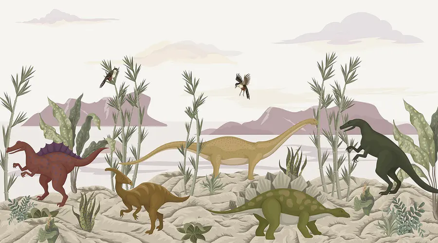Transformați orice spațiu cu această pictură murală vibrantă care prezintă un grup plin de viață de dinozauri explorând un peisaj deșertic. Imaginați-vă că intrați într-o cameră în care giganți prietenoși precum blândul Brachiosaurus și curiosul Stegosaurus par să prindă viață pe pereții dvs. Tonurile pământii moi și verdele jucăuș creează o atmosferă calmă, dar incitantă. Este o sursă perfectă de conversație – copiilor le va plăcea să își arate favoritele în timp ce visează în secret la aventuri preistorice. Fie că se află într-o cameră de joacă sau într-un colțișor confortabil, această pictură murală vă poartă într-o lume în care dinozaurii prosperă. Cine nu și-ar dori un pic de magie dinozaurică în spațiul său?