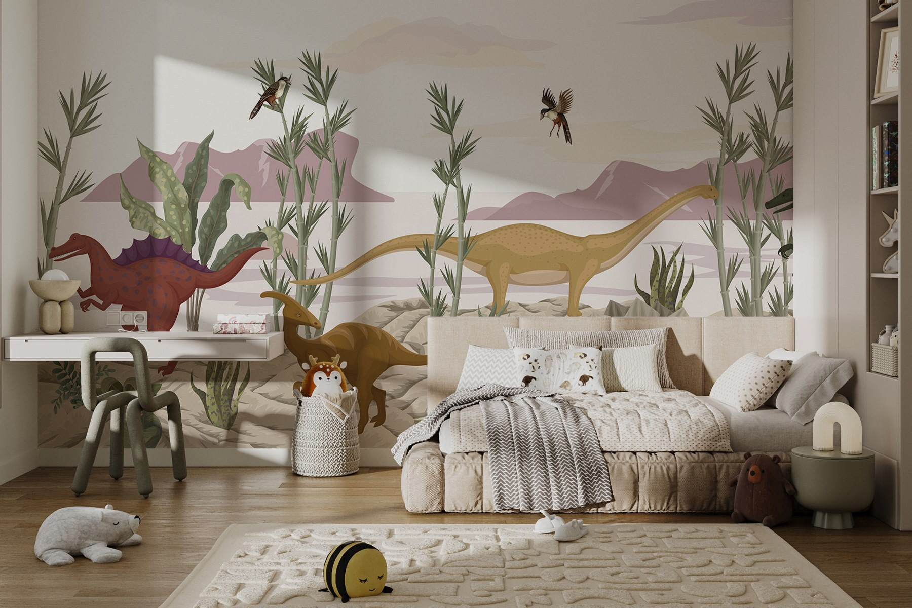 Transformați orice spațiu cu această pictură murală vibrantă care prezintă un grup plin de viață de dinozauri explorând un peisaj deșertic. Imaginați-vă că intrați într-o cameră în care giganți prietenoși precum blândul Brachiosaurus și curiosul Stegosaurus par să prindă viață pe pereții dvs. Tonurile pământii moi și verdele jucăuș creează o atmosferă calmă, dar incitantă. Este o sursă perfectă de conversație – copiilor le va plăcea să își arate favoritele în timp ce visează în secret la aventuri preistorice. Fie că se află într-o cameră de joacă sau într-un colțișor confortabil, această pictură murală vă poartă într-o lume în care dinozaurii prosperă. Cine nu și-ar dori un pic de magie dinozaurică în spațiul său?