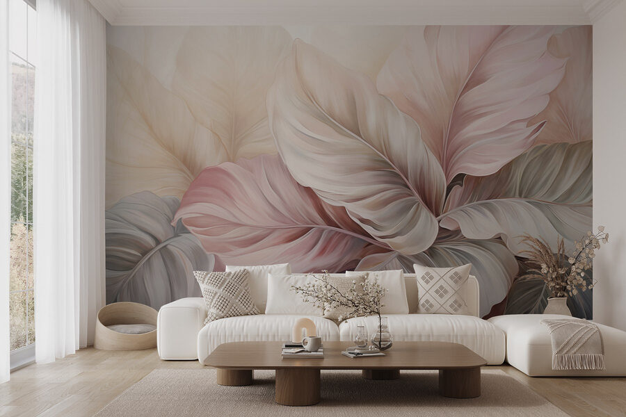 Transformați-vă spațiul cu această pictură murală uimitoare, “Nuanțele moi ale naturii se întrepătrund frumos.” Imaginați-vă-o acum – frunze luxuriante în roz blând și gri moale, îmbrățișându-vă pereții într-o îmbrățișare blândă. Este ca și cum ai aduce o grădină senină în interior, invitând calmul și căldura în fiecare colț.