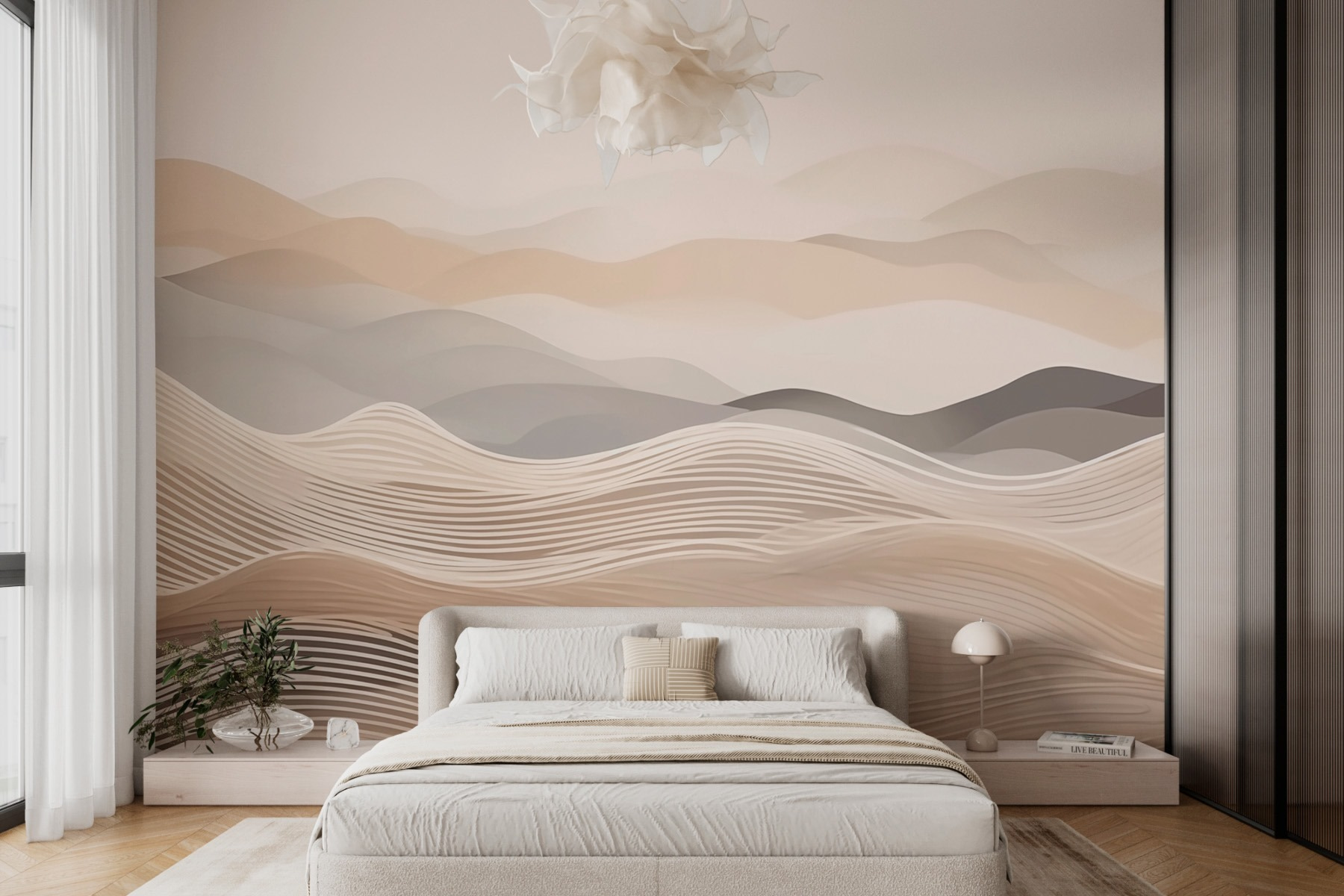 Transformați orice perete într-o evadare confortabilă cu această pictură murală care prezintă dealuri blânde în valuri moi de alb și maro. Este ca și cum ai aduce o felie de natură chiar în inima casei tale. Imaginați-vă că vă relaxați cu o carte bună sau doar sorbind o cafea în timp ce priviți aceste curbe liniștitoare. Par aproape că se unduiesc ca o mare calmă – perfect pentru a crea o atmosferă liniștită. Tonurile subtile ale acestei picturi murale se potrivesc de minune cu orice decor, ceea ce o face un fundal fantastic pentru aventurile tale în materie de design interior. Totul constă în găsirea echilibrului între confort și stil, nu credeți? Adaugă o notă de liniște spațiului tău; la urma urmei, cine nu vrea ca locuința sa să se simtă ca o îmbrățișare caldă?