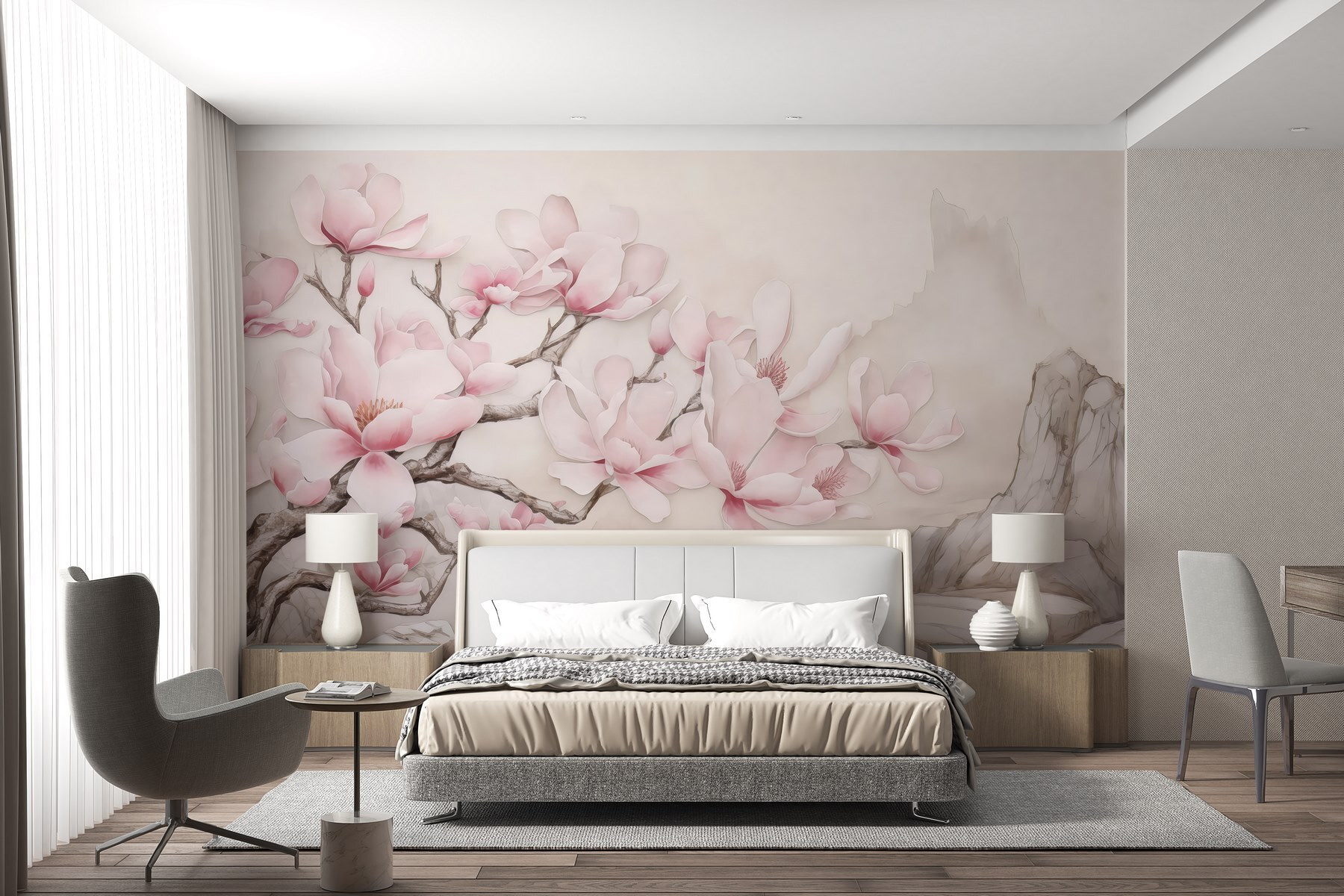 Transformați-vă spațiul cu o atingere a farmecului naturii prin această frumoasă pictură murală de perete cu un copac împodobit cu flori roz fericite. Imaginați-vă că vă treziți și simțiți că vă plimbați printr-o grădină senină în fiecare zi. Culorile blânde creează o atmosferă liniștitoare, perfectă pentru colțuri confortabile sau pereți de decor. Este ca o gură de aer proaspăt pentru camera dvs. – nu este nevoie de degetul mare verde! Perfect pentru a visa cu ochii deschiși, pentru colțuri confortabile pentru cărți sau pur și simplu pentru a vă bucura de acel vibe relaxat. Pereții dvs. vă vor mulțumi! Imaginați-vă doar sorbind cafea în timp ce vă bucurați de frumusețe – ce mod de a începe ziua!