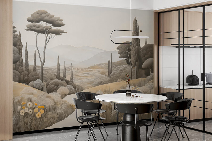 Transformați-vă spațiul cu această murală uimitoare, “Peisaj cu un drum sinuos și copaci”. Acesta aduce la viață un peisaj rural senin, invitând natura în interior, fără mizeria de afară. Imaginați-vă sorbind cafea într-o duminică leneșă în timp ce priviți dealurile blânde și copacii legănându-se – este ca o mini-vacanță chiar pe peretele dvs. Perfectă pentru acele momente de vis, această pictură murală vă învăluie camera în tonuri calde, pământii și detalii moi care vă fac să doriți să respirați adânc. Șoptește relaxare, amintindu-ți de plimbările liniștite sub cerul liber. Imaginați-vă doar conversațiile pe care le-ar putea stârni sau vibrațiile calme pe care le aduce – ce atingere dulce pentru orice colțișor!