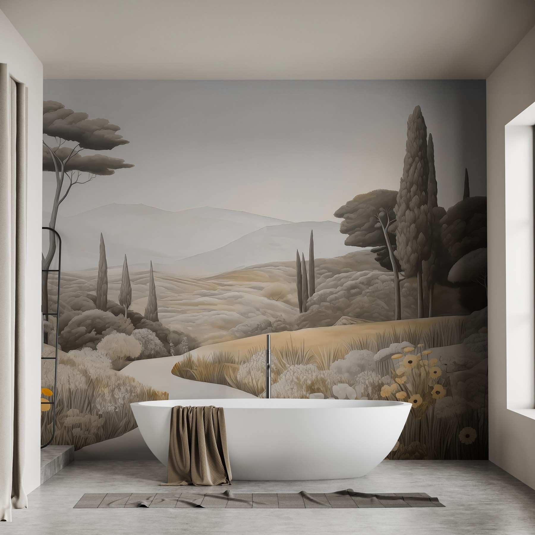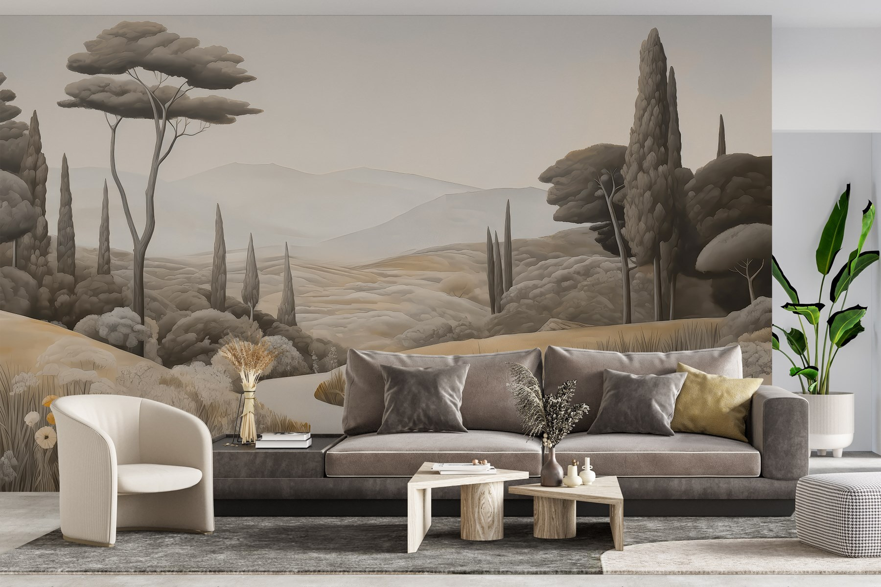 Transformați-vă spațiul cu această murală uimitoare, “Peisaj cu un drum sinuos și copaci”. Acesta aduce la viață un peisaj rural senin, invitând natura în interior, fără mizeria de afară. Imaginați-vă sorbind cafea într-o duminică leneșă în timp ce priviți dealurile blânde și copacii legănându-se – este ca o mini-vacanță chiar pe peretele dvs. Perfectă pentru acele momente de vis, această pictură murală vă învăluie camera în tonuri calde, pământii și detalii moi care vă fac să doriți să respirați adânc. Șoptește relaxare, amintindu-ți de plimbările liniștite sub cerul liber. Imaginați-vă doar conversațiile pe care le-ar putea stârni sau vibrațiile calme pe care le aduce – ce atingere dulce pentru orice colțișor!