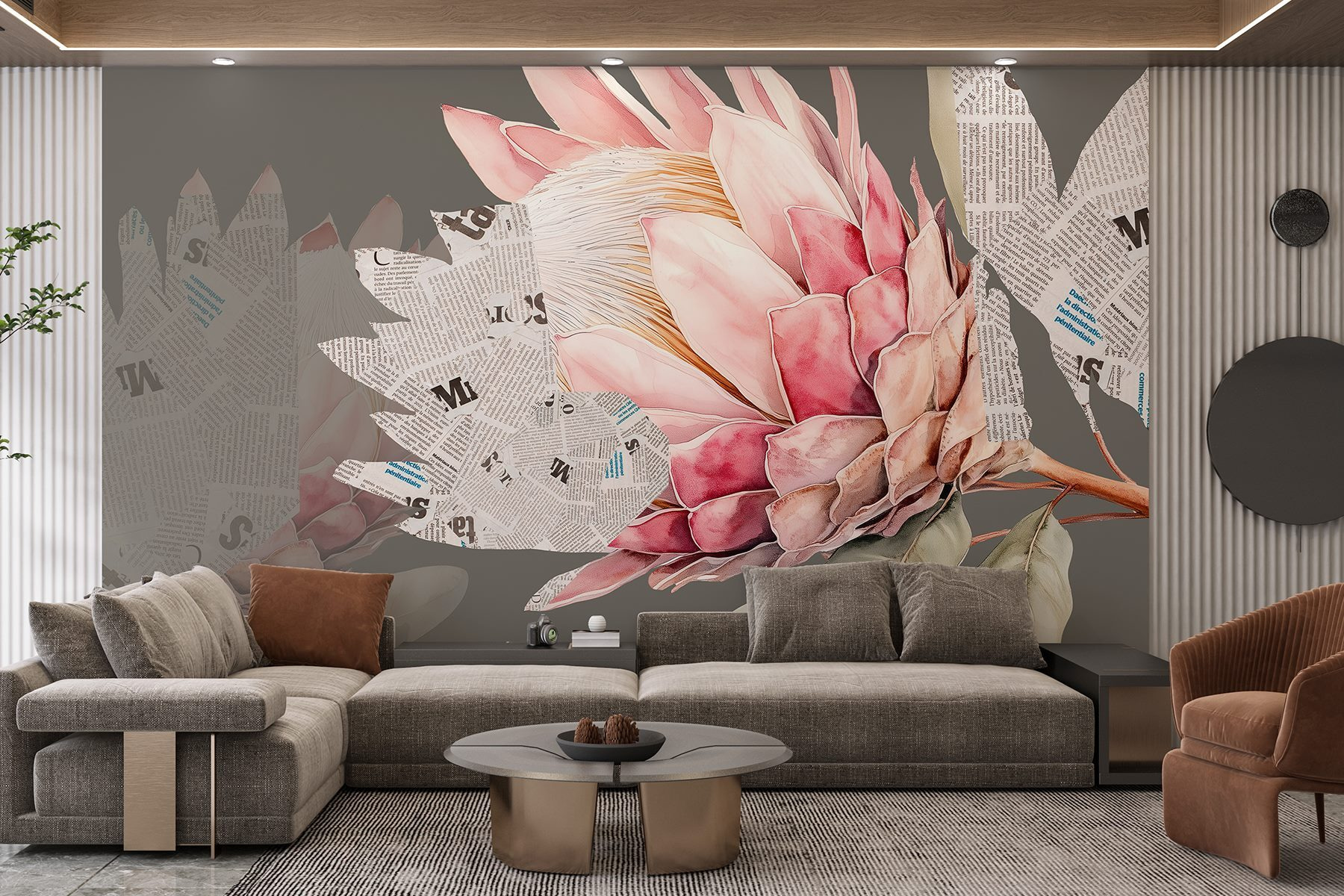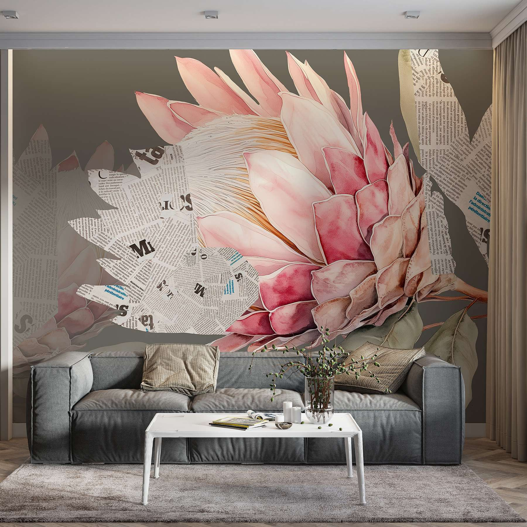 Transformați orice cameră cu această pictură murală încântătoare care prezintă o floare uimitoare înconjurată de frunze capricioase și bucăți de ziar. Este ca și cum natura și creativitatea au avut o discuție încântătoare și au decis să agite puțin lucrurile. Imaginați-vă că intrați în spațiul dvs. și sunteți întâmpinați de petale vibrante care par să se desprindă direct de pe perete, invitându-vă să vă opriți și să vă bucurați de frumusețe. Această pictură murală adaugă o adiere proaspătă de farmec și caracter, fiind decorul perfect pentru dimineți confortabile cu cafea sau seri pline de inspirație și râsete. Oricine s-ar simți înălțat doar stând lângă ea, ca și cum fiecare privire ar aduce un pic de soare în casă. Nu este doar decor; este o stare de spirit!