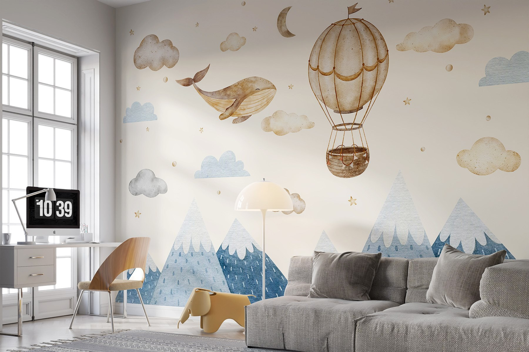 Imaginați-vă că intrați într-o cameră plină de nori, stele și o balenă jucăușă care zboară pe lângă un balon cu aer cald capricios. Această pictură murală nu este doar un decor; este o aventură care așteaptă să se întâmple! Imaginați-vă copii, cu ochii larg deschiși, imaginându-și că pleacă într-o călătorie la înălțime, în timp ce adulții nu se pot abține să nu zâmbească la scena fermecătoare. Paleta de culori liniștitoare aduce un vibe calm – grozav pentru dormitoare sau colțuri confortabile. Fie că visați, vă lăsați gândurile în voia sorții sau pur și simplu prindeți un moment de liniște, această pictură murală adaugă o notă unică care pare atât magică, cât și jucăușă. Perfect pentru a stârni imaginația!