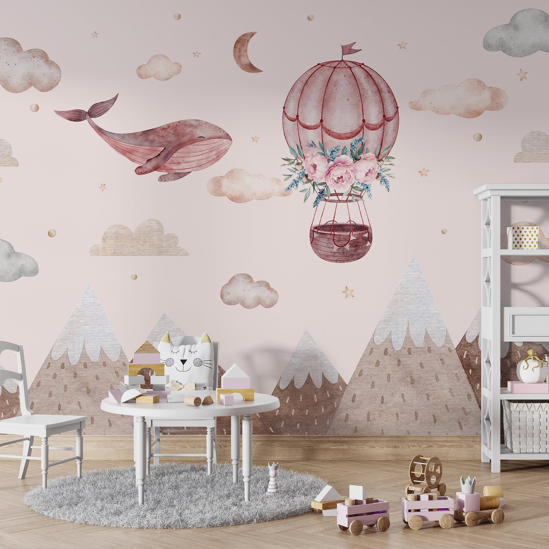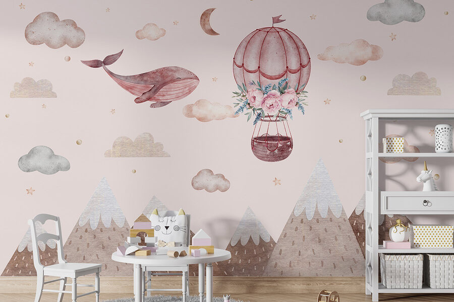 Imaginați-vă o lume capricioasă în care balenele planează pe cer – da, asta se întâmplă chiar aici, cu această pictură murală! Cu un fermecător balon cu aer cald împodobit cu flori delicate, este o scenă încântătoare care stârnește imaginația. Imaginați-vă-o transformând camera unui copil sau un colț de lectură confortabil într-o evadare de vis. Culorile suave și munții blânzi creează o atmosferă senină, perfectă pentru relaxare cu o carte bună sau pentru a visa cu ochii deschiși. Este ca o mică aventură chiar pe perete – cine nu și-ar dori să navigheze în nori cu o balenă prietenoasă? Doar atârnă-l și lasă magia să se desfășoare!