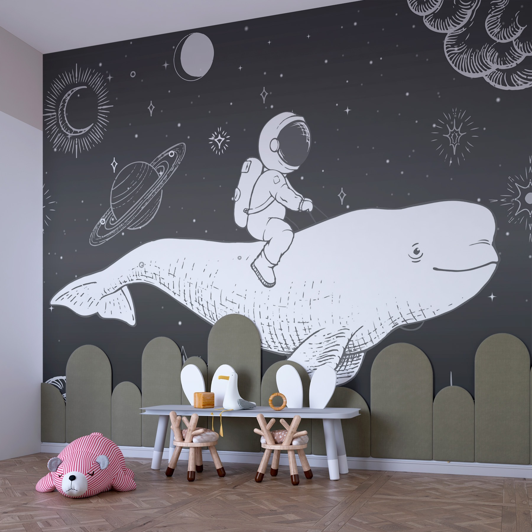 Transformați orice spațiu cu această pictură murală capricioasă cu un astronaut aventuros care călărește o balenă printr-un tărâm cosmic al minunilor. Imaginați-vă: o cameră de zi senină sau o zonă de joacă pentru copii devine un portal către imaginație, stârnind bucurie de fiecare dată când cineva intră. Amestecul jucăuș de viață oceanică și cerul înstelat invită la visare, ca și cum ar încuraja o conversație secretă între mare și stele. Nu este doar decor; este un memento zilnic pentru a explora neconvenționalul. Așadar, dați-i drumul, adăugați un strop de uimire pereților și lăsați imaginația să zburde!