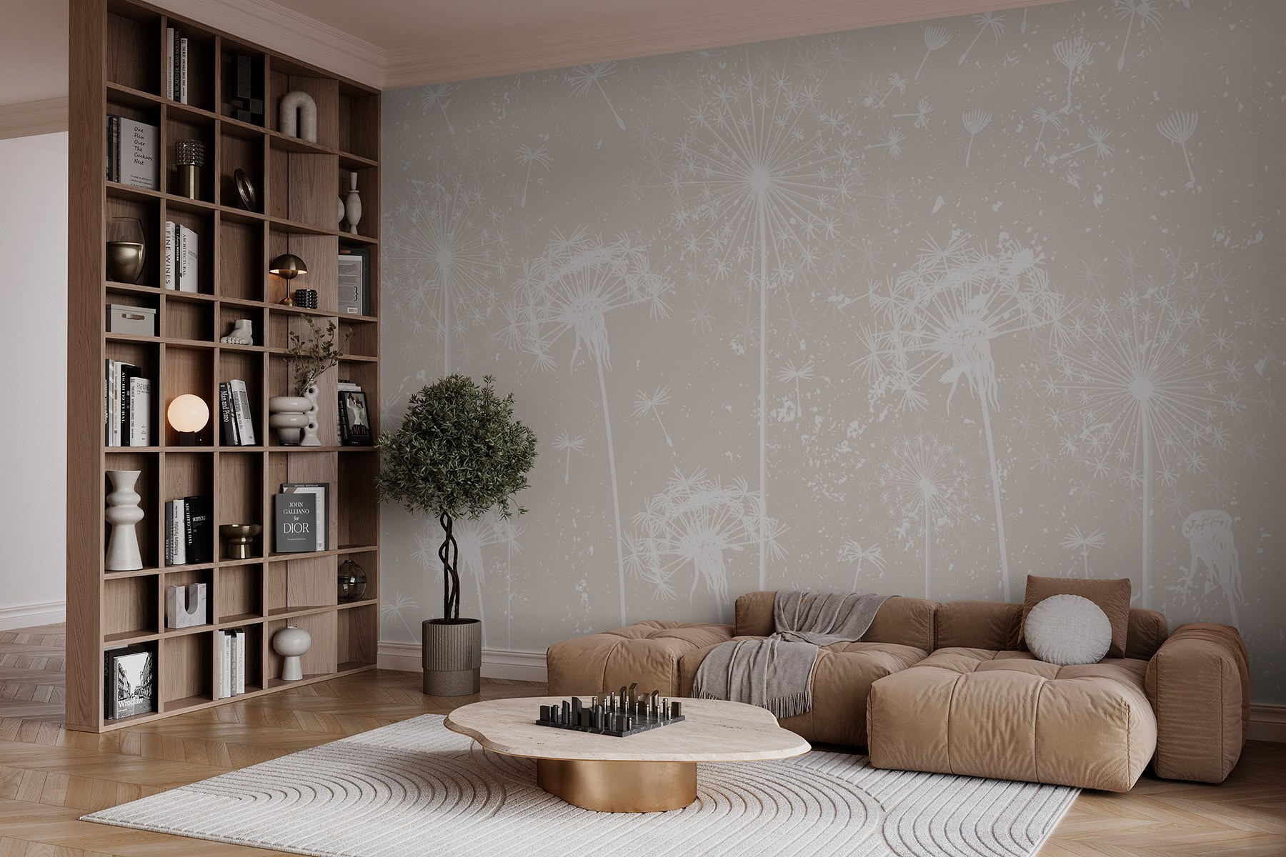 Imaginați-vă acest lucru: un spațiu senin transformat de frumusețea blândă a florilor albe de păpădie. Această pictură murală nu este doar decor; este ca și cum ai aduce o briză blândă în interior, șoptindu-ți povești despre lejeritate și vise. Cu aceste flori delicate așezate pe un fundal cald, fiecare privire se simte ca o mică evadare în natură.