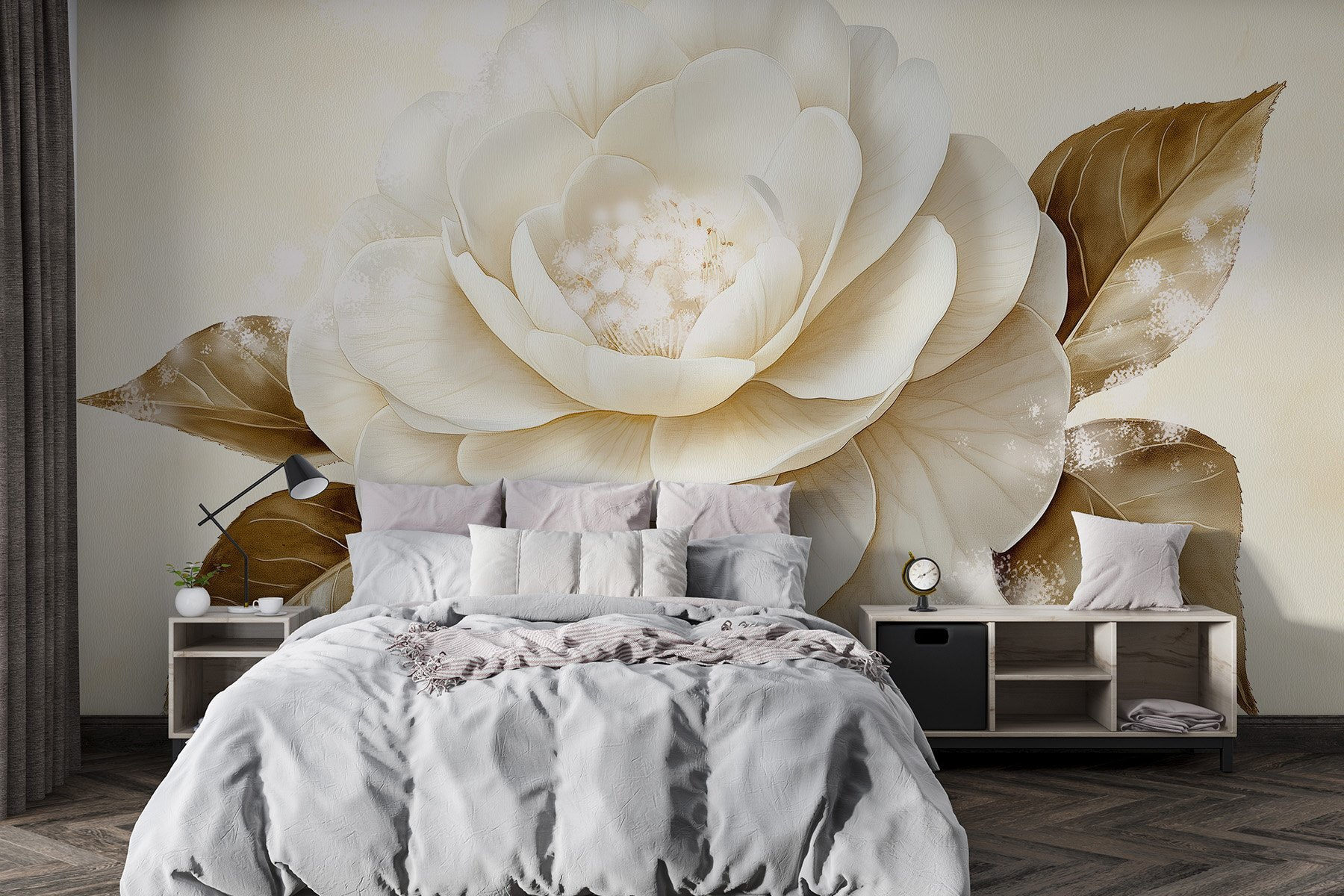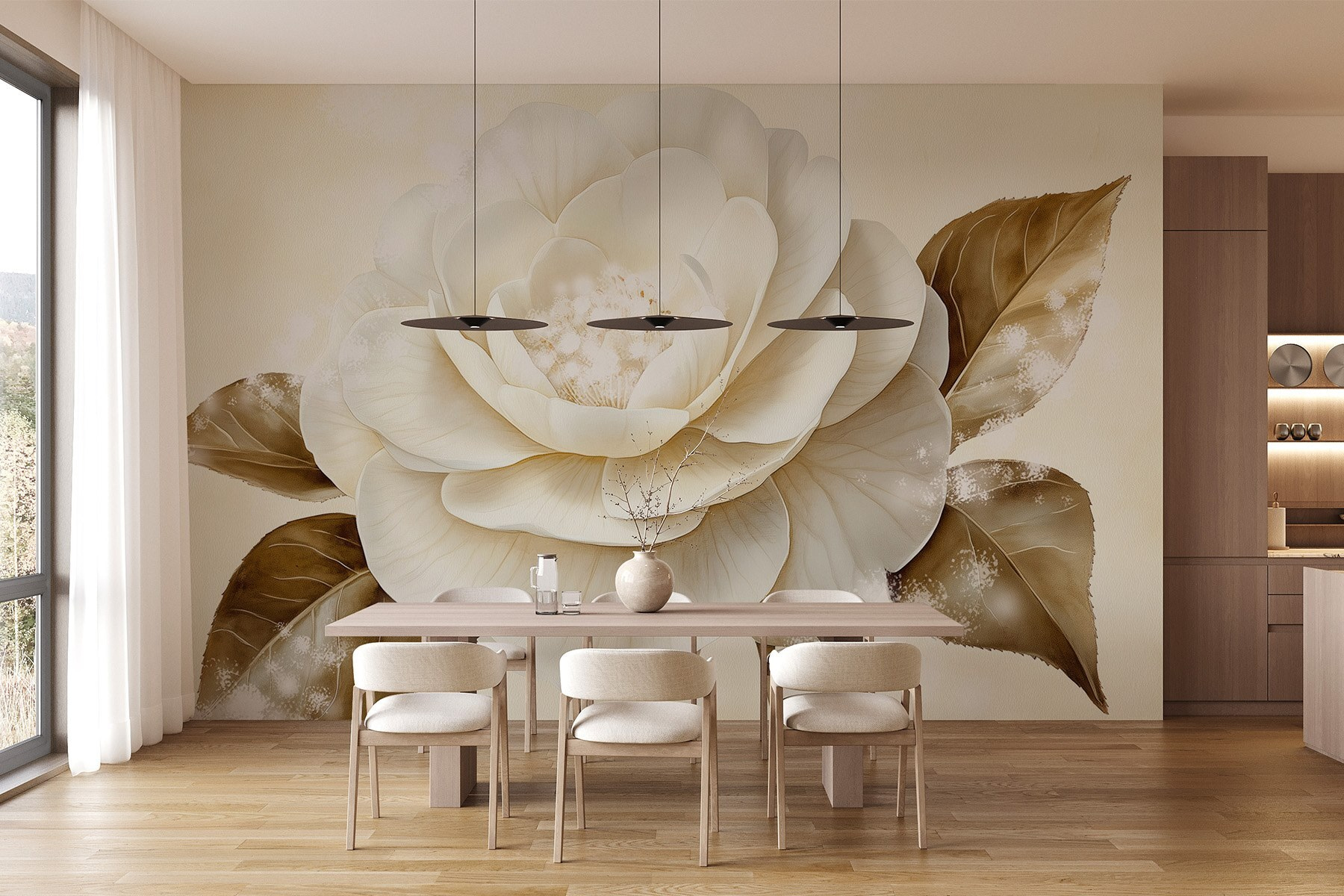Transformați-vă spațiul cu această pictură murală uimitoare, care prezintă o floare albă frumoasă împerecheată cu frunze maro calde. Imaginați-vă că pășiți într-o cameră în care această lucrare de artă vă întâmpină, umplând-o cu un sentiment de calm și farmecul naturii. Nuanțele blânde și detaliile delicate atrag privirea, făcând-o perfectă pentru un living confortabil sau un dormitor senin. Vizitatorii s-ar putea să se oprească pentru a-i admira frumusețea, poate chiar să fie inspirați să se relaxeze cu o carte bună în apropiere. Este ca și cum ai aduce un pic de aer liber înăuntru – fără polen. O schimbare simplă care stârnește bucurie, nu credeți?