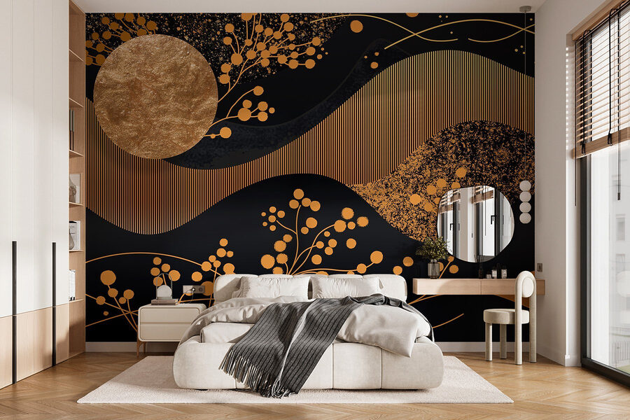Transformați orice spațiu într-un refugiu confortabil cu această pictură murală uimitoare, “Modele elegante pe o pânză întunecată”. Imaginați-vă că stați în camera dvs., deoarece această pictură murală surprinde un dans intrigant de linii fluide și grupuri fermecătoare care așteaptă doar să stârnească conversația. Culorile profunde evocă o atmosferă calmă și sofisticată, perfectă pentru a crea un colț relaxant sau chiar o zonă de living plină de viață. Oaspeții s-ar putea trezi atrași de modelele sale, meditând la semnificația lor sau doar admirând frumusețea.