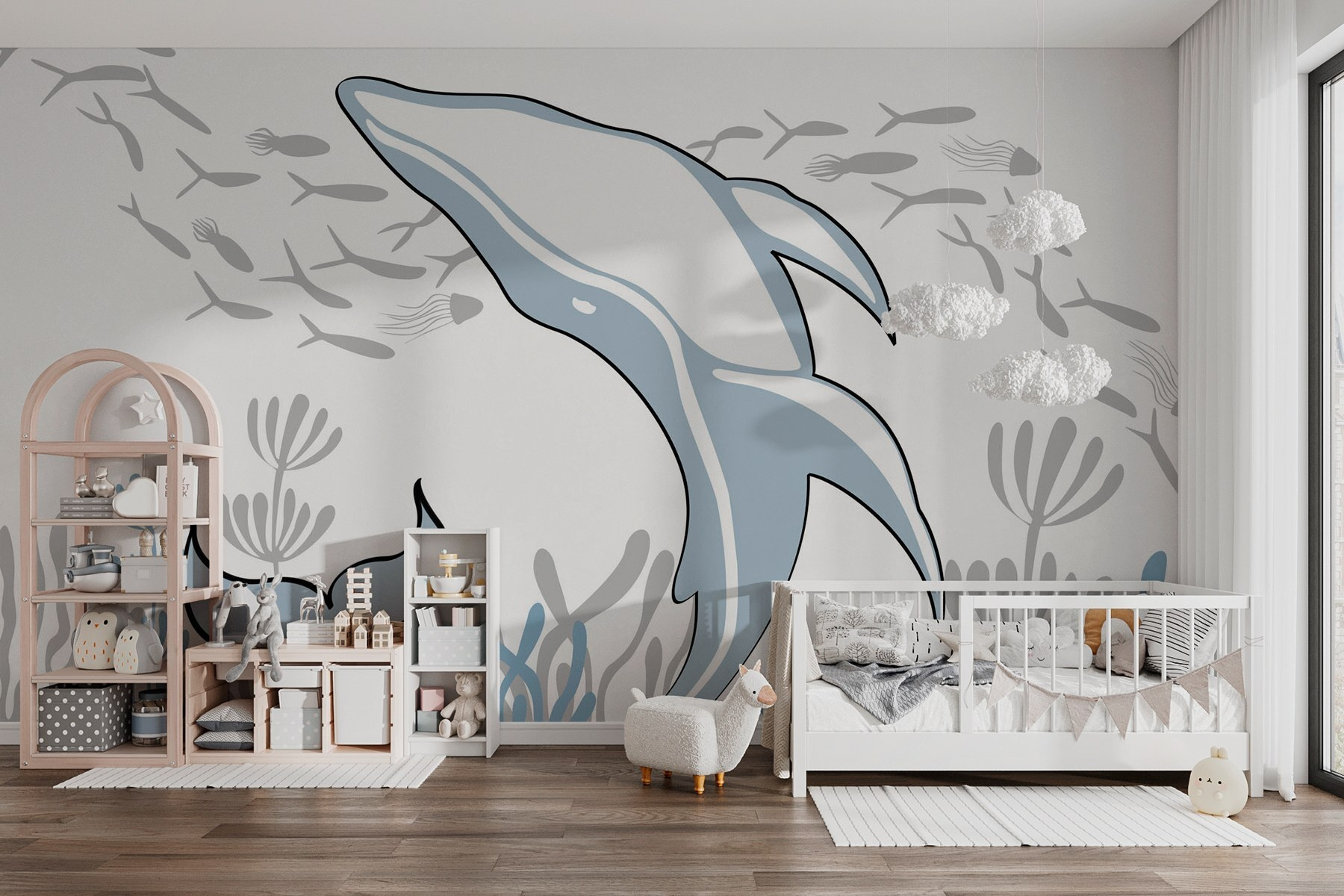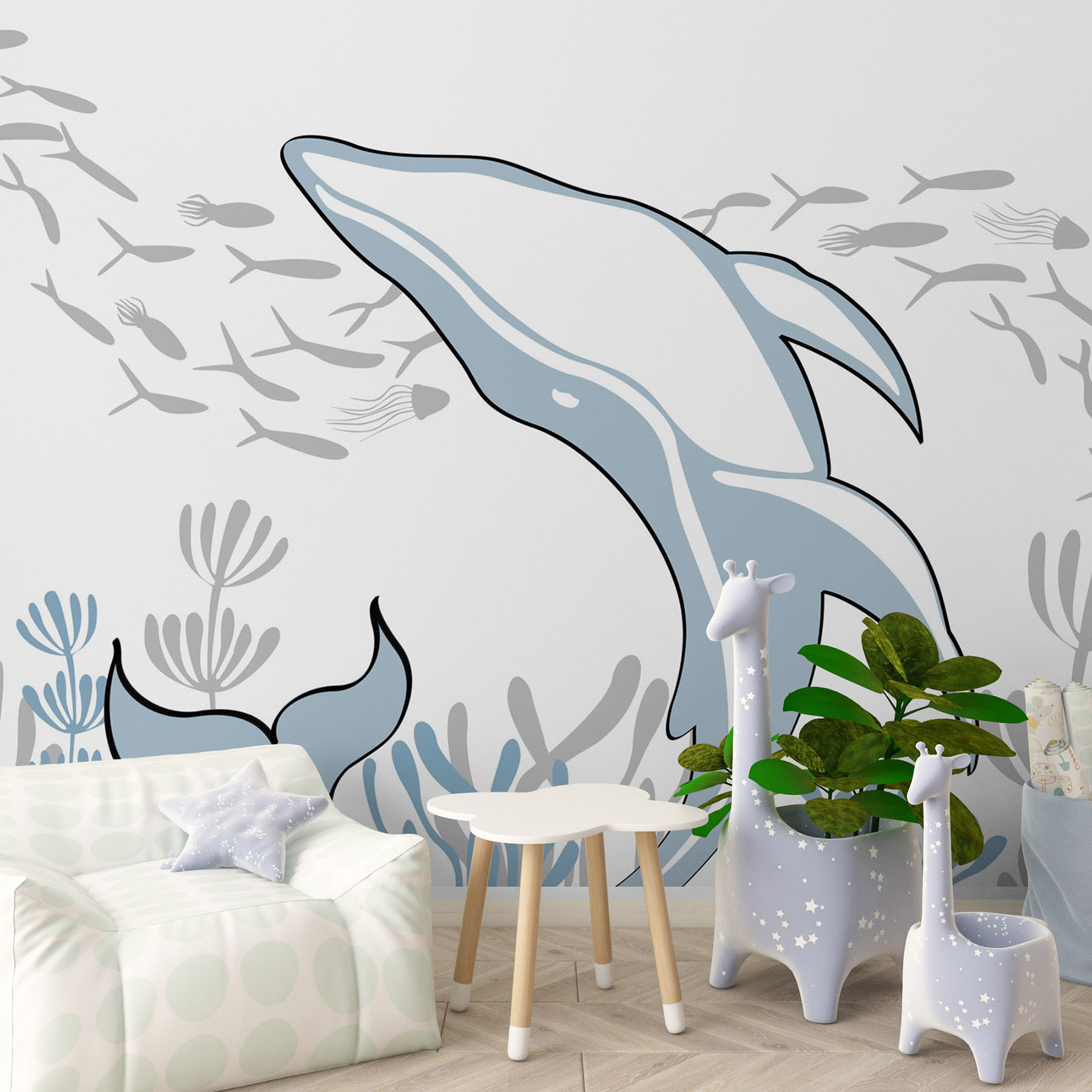 Scufundați-vă într-o lume a minunilor cu această pictură murală cu un delfin jucăuș înotând în ocean. Imaginați-vă că transformați o cameră într-o oază subacvatică, unde fiecare privire la pictura murală vă poate purta spre valurile însorite și briza mării. Culorile liniștitoare creează un vibe relaxat – perfect pentru un colț de lectură confortabil sau o cameră de joacă vibrantă. Imaginați-vă copii chicotind în timp ce zăresc prietenii pești zburând. Gândiți-vă că fiecare zi ar putea fi ca o zi de plajă. Lăsați căldura oceanului să vă învăluie spațiul, făcându-l să se simtă ca o vacanță acasă!